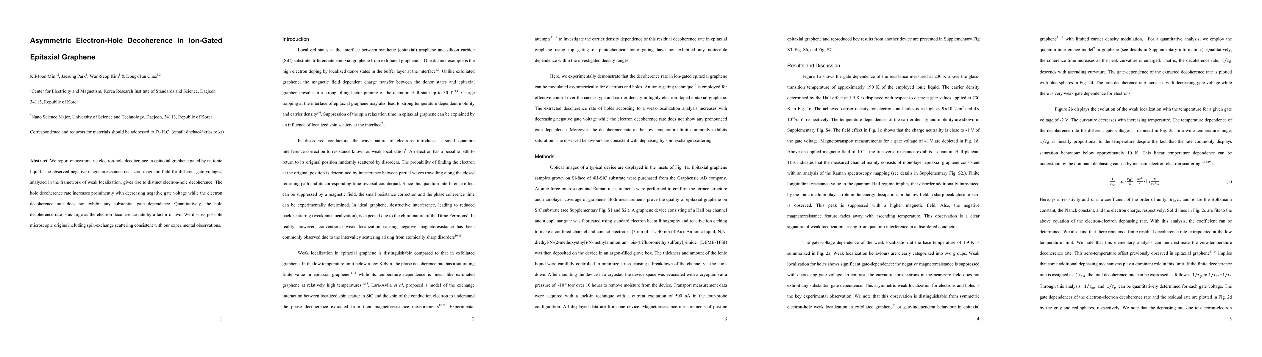 This paper investigates asymmetric electron-hole decoherence in ion-gated epitaxial graphene, revealing that hole decoherence significantly increases with negative gate voltage while electron decoherence remains largely unaffected. The findings suggest spin-exchange scattering as a potential microscopic origin for these observations.