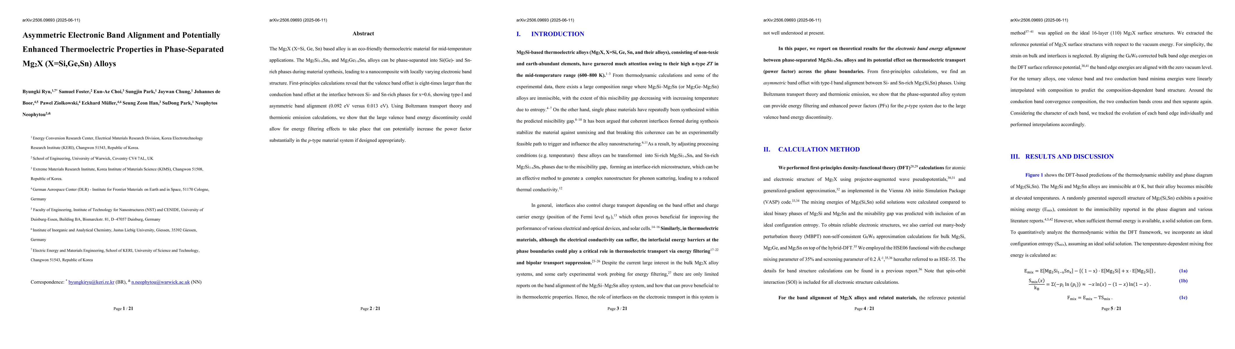 The Mg2X (X=Si, Ge, Sn) based alloy is an eco-friendly thermoelectric material for mid-temperature applications. The Mg2Si1-xSnx and Mg2Ge1-xSnx alloys can be phase-separated into Si(Ge)- and Sn-rich phases during material synthesis, leading to a nanocomposite with locally varying electronic band structure. First-principles calculations reveal that the valence band offset is eight-times larger than the conduction band offset at the interface between Si- and Sn-rich phases for x=0.6, showing type-I and asymmetric band alignment (0.092 eV versus 0.013 eV). Using Boltzmann transport theory and thermionic emission calculations, we show that the large valence band energy discontinuity could allow for energy filtering effects to take place that can potentially increase the power factor substantially in the p-type material system if designed appropriately.