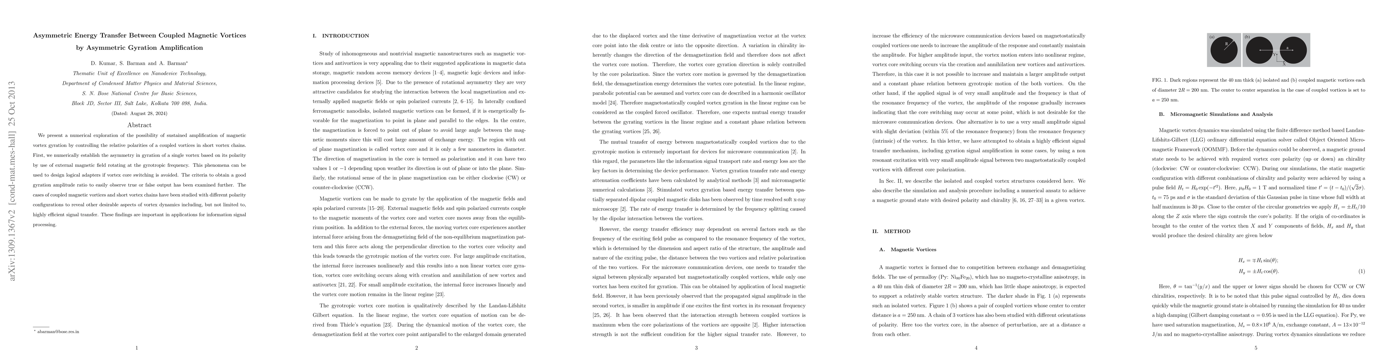 This paper explores the amplification of magnetic vortex gyration through asymmetric coupling in short vortex chains, demonstrating potential for efficient signal transfer and logical adapter design in information processing. Numerical simulations reveal desirable vortex dynamics based on polarity configurations.
