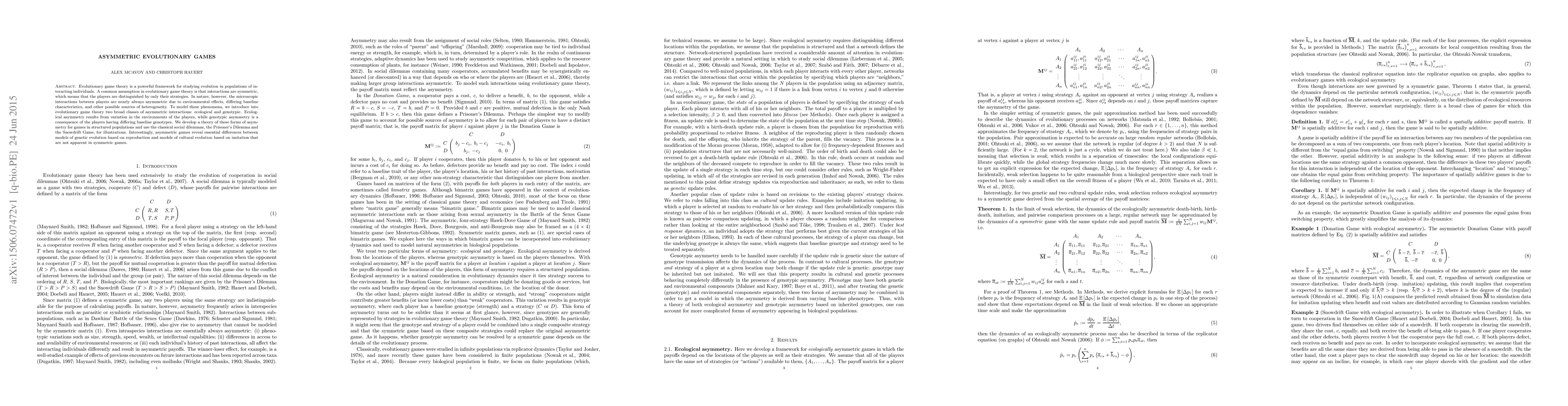 This paper introduces asymmetric evolutionary games to model interactions in populations where players differ due to environmental and genetic factors. It develops theories for ecological and genotypic asymmetries, illustrating their implications using classical social dilemmas, and highlights differences in genetic versus cultural evolution models.