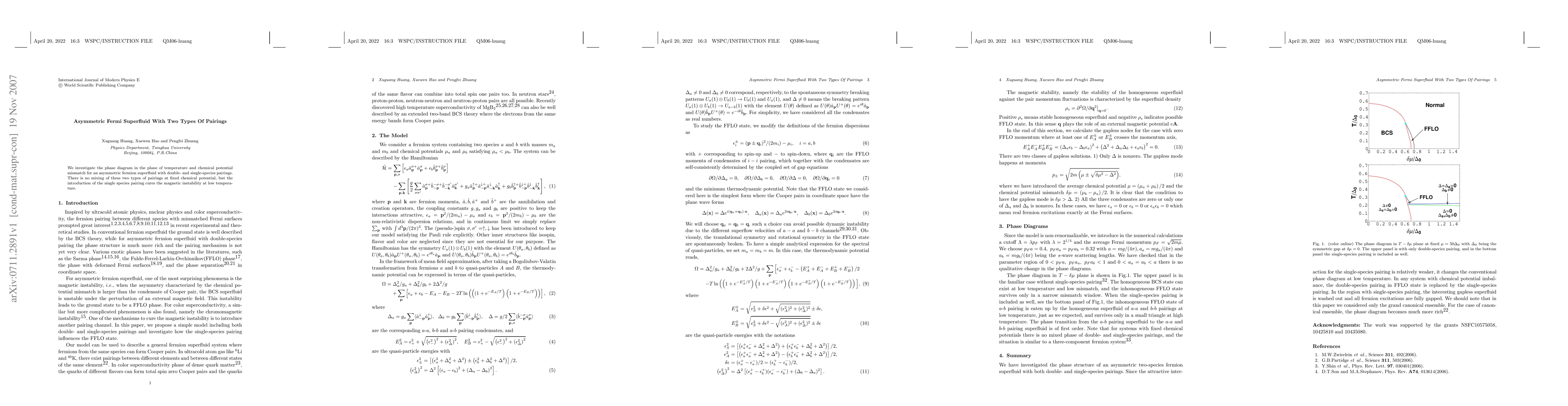This paper explores the phase diagram of an asymmetric fermion superfluid featuring both double- and single-species pairings, revealing that these pairings do not mix at constant chemical potential. The study finds that single-species pairings mitigate magnetic instability at low temperatures.