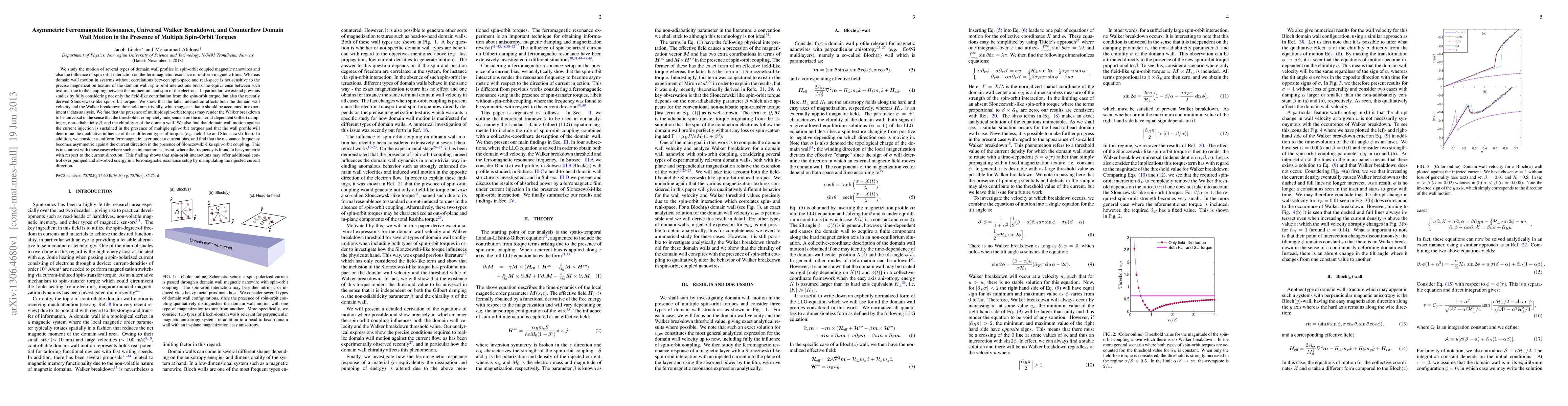 The paper presents a comprehensive theoretical analysis of domain wall motion and ferromagnetic resonance under the influence of multiple spin-orbit torques, identifying conditions for universal Walker breakdown and asymmetric resonance frequencies.