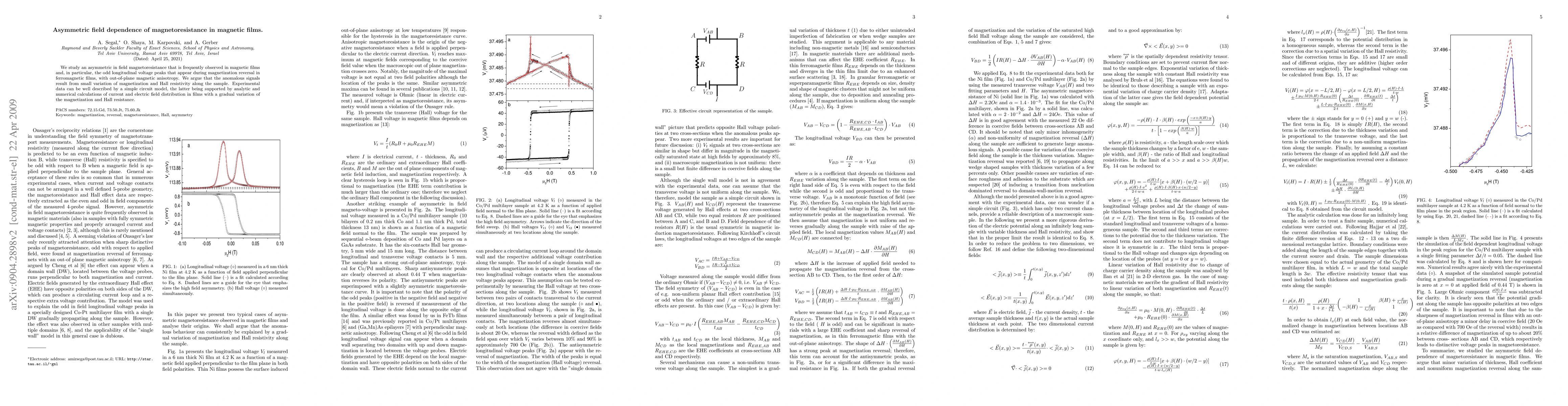 This paper investigates the asymmetric magnetoresistance in magnetic films, focusing on odd longitudinal voltage peaks during magnetization reversal. The study attributes these anomalies to small variations in magnetization and Hall resistivity, supported by a simple circuit model and calculations of current and electric field distribution.