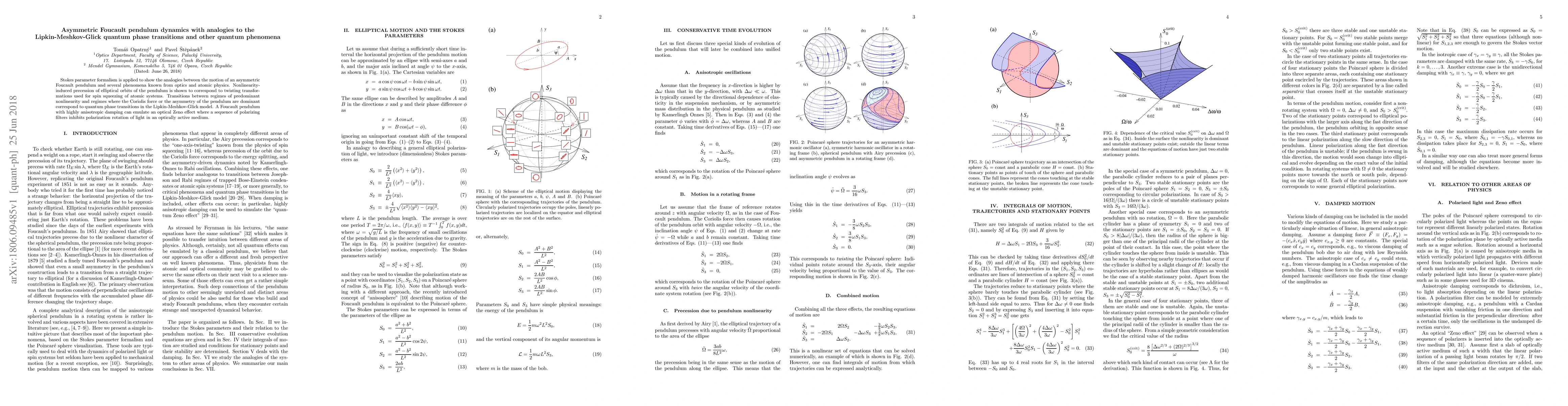 This research uses Stokes parameter formalism to draw analogies between the dynamics of an asymmetric Foucault pendulum and quantum phenomena like the Lipkin-Meshkov-Glick phase transitions, highlighting how the pendulum's nonlinear precession mirrors atomic spin squeezing, and its transitions emulate quantum phase transitions.
