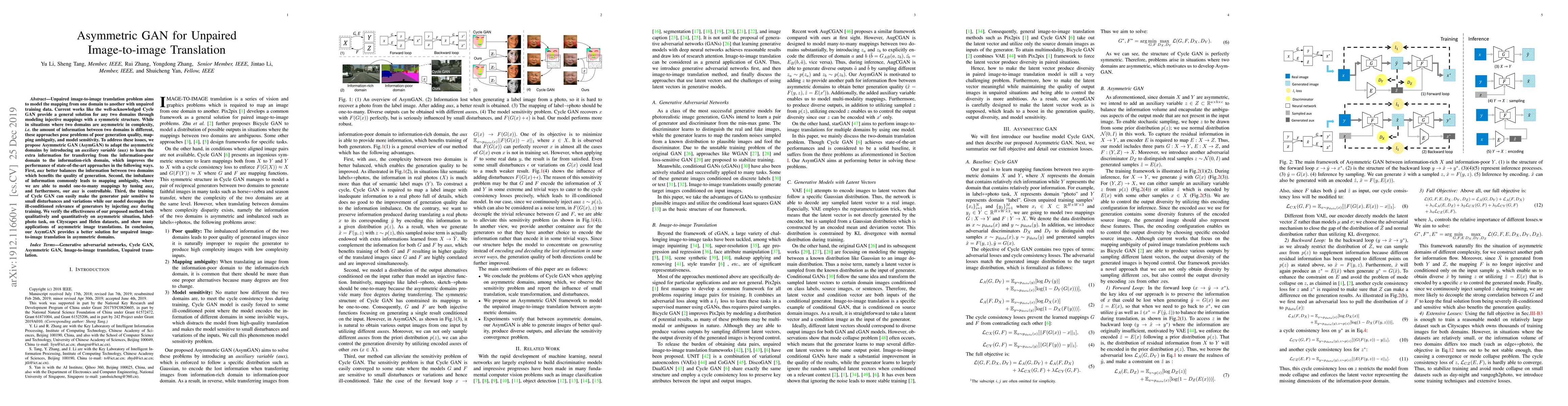 The paper proposes Asymmetric GAN (AsymGAN) to tackle the unpaired image-to-image translation problem in asymmetric domains, where domains differ in complexity. AsymGAN introduces an auxiliary variable to balance information, model one-to-many mappings, and decouple generator sensitivity, achieving better translation quality and stability.