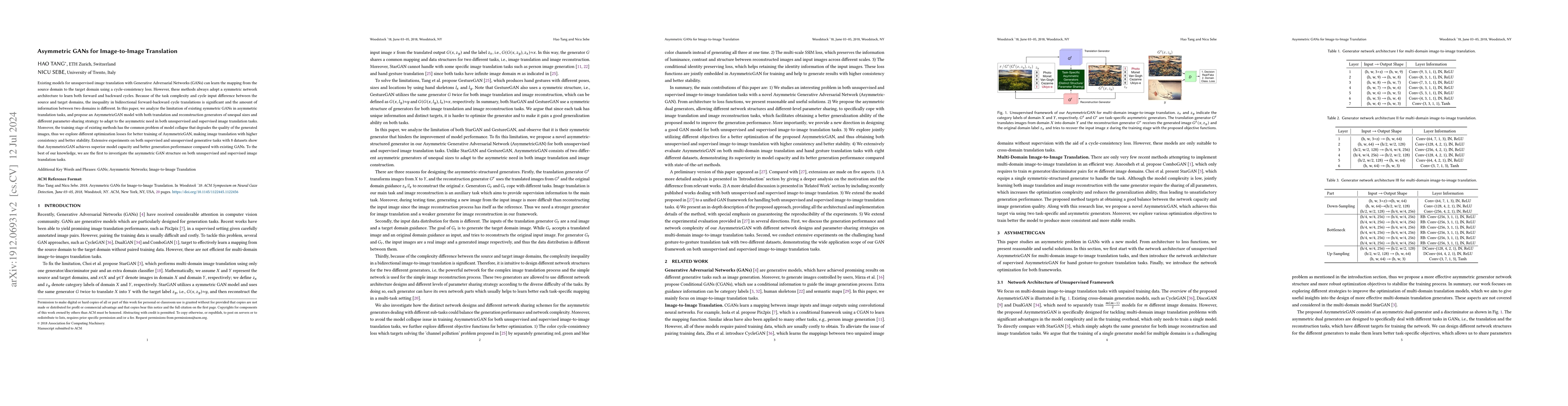 This paper proposes AsymmetricGAN, an advanced GAN model for image-to-image translation that addresses the limitations of symmetric architectures by employing unequal-sized translation and reconstruction generators. The model achieves better performance and stability in both unsupervised and supervised translation tasks, as demonstrated by extensive experiments.