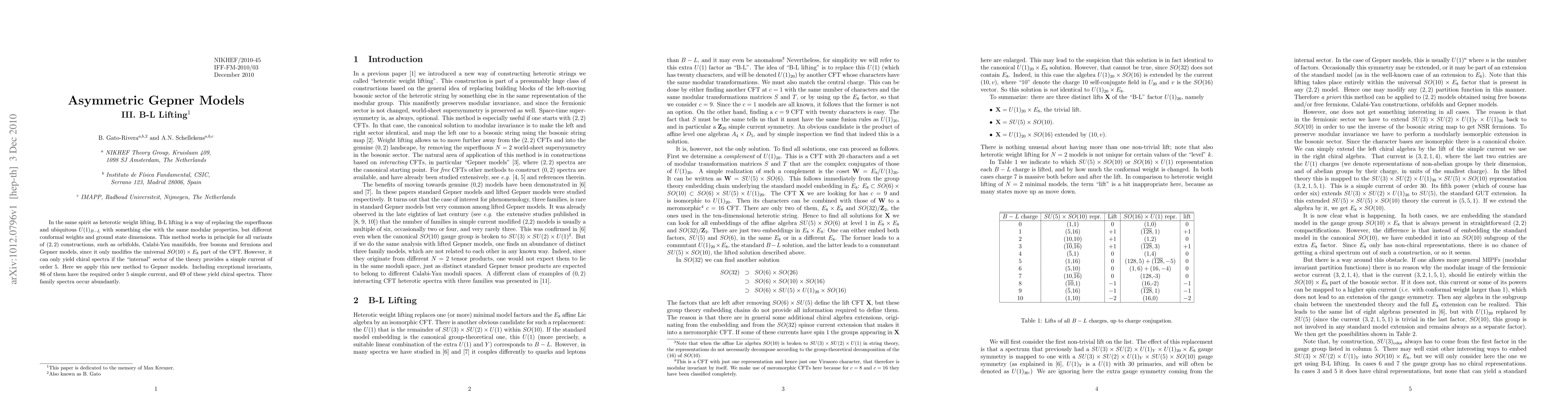 This paper explores B-L lifting in asymmetric Gepner models, a method that replaces the U(1)_{B-L} symmetry with another possessing the same modular properties but different conformal weights and ground state dimensions. It successfully applies this technique to Gepner models, finding that 86 of them possess the necessary order 5 simple current, with 69 yielding chiral spectra and three family spectra prevalent.