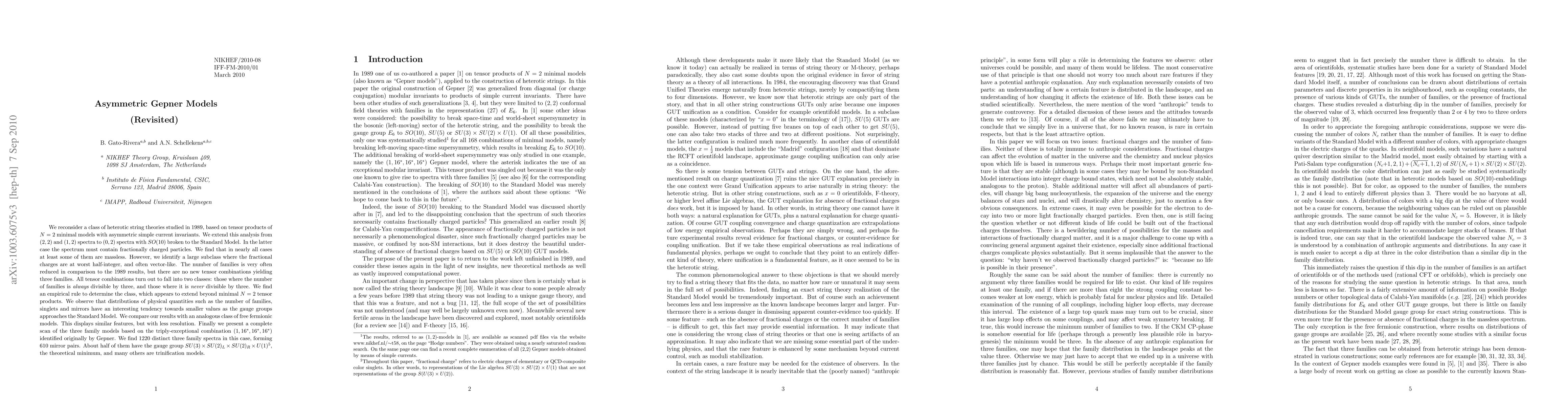 We reconsider a class of heterotic string theories studied in 1989, based on tensor products of N=2 minimal models with asymmetric simple current invariants. We extend this analysis from (2,2) and (1,2) spectra to (0,2) spectra with SO(10) broken to the Standard Model. In the latter case the spectrum must contain fractionally charged particles. We find that in nearly all cases at least some of them are massless. However, we identify a large subclass where the fractional charges are at worst half-integer, and often vector-like. The number of families is very often reduced in comparison to the 1989 results, but there are no new tensor combinations yielding three families. All tensor combinations turn out to fall into two classes: those where the number of families is always divisible by three, and those where it is never divisible by three. We find an empirical rule to determine the class, which appears to extend beyond minimal N=2 tensor products. We observe that distributions of physical quantities such as the number of families, singlets and mirrors have an interesting tendency towards smaller values as the gauge groups approaches the Standard Model. We compare our results with an analogous class of free fermionic models. This displays similar features, but with less resolution.Finally we present a complete scan of the three family models based on the triply-exceptional combination (1,16*,16*,16*) identified originally by Gepner. We find 1220 distinct three family spectra in this case, forming 610 mirror pairs. About half of them have the gauge group SU(3) x SU(2)_L x SU(2)_R x U(1)^5, the theoretical minimum, and many others are trinification models.