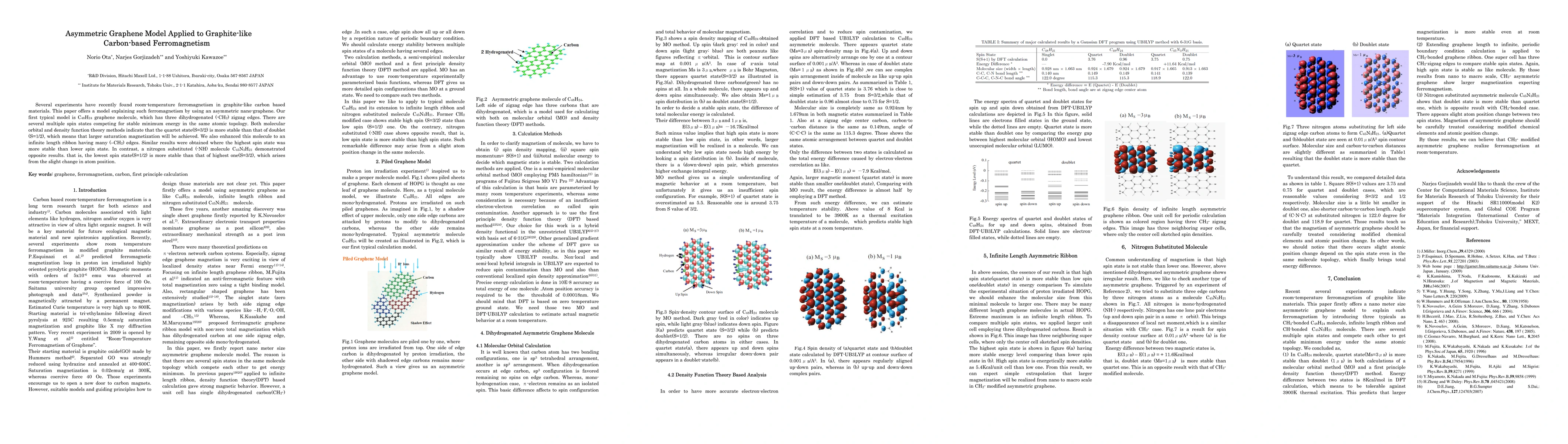 This paper proposes an asymmetric graphene model to explain ferromagnetism in graphite-like carbon materials, finding that a C48H24 graphene molecule with dihydrogenated zigzag edges exhibits a quartet state (S=3/2) as the most stable, leading to higher saturation magnetization. Conversely, a nitrogen-substituted C45N3H21 molecule shows a doublet state (S=1/2) as the stable configuration.