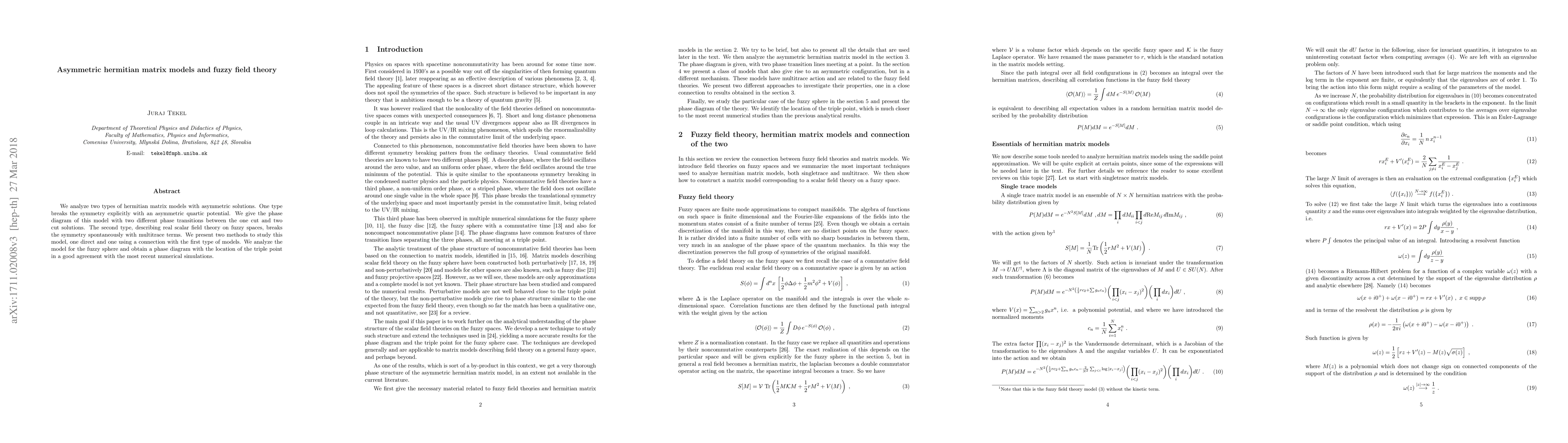 This paper investigates two asymmetric hermitian matrix models: one with an explicit symmetry breaking via an asymmetric quartic potential and a phase diagram with two transitions, and another describing real scalar field theory on fuzzy spaces with spontaneous symmetry breaking and multitrace terms. It also connects the two models and validates the fuzzy sphere model's phase diagram against recent numerical simulations.