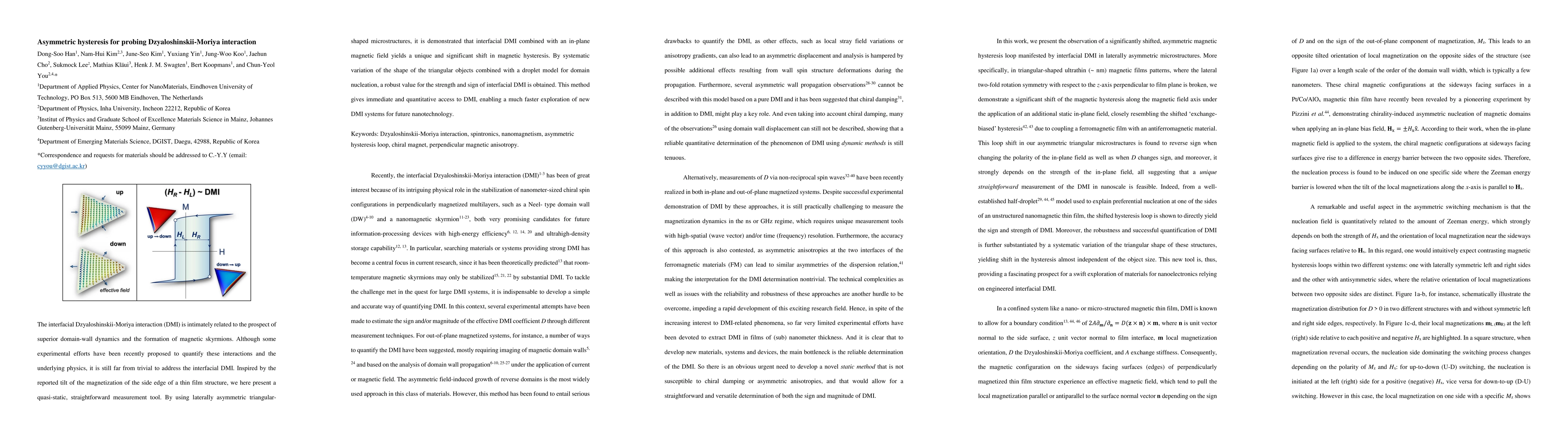 The interfacial Dzyaloshinskii-Moriya interaction (DMI) is intimately related to the prospect of superior domain-wall dynamics and the formation of magnetic skyrmions. Although some experimental efforts have been recently proposed to quantify these interactions and the underlying physics, it is still far from trivial to address the interfacial DMI. Inspired by the reported tilt of the magnetization of the side edge of a thin film structure, we here present a quasi-static, straightforward measurement tool. By using laterally asymmetric triangular-shaped microstructures, it is demonstrated that interfacial DMI combined with an in-plane magnetic field yields a unique and significant shift in magnetic hysteresis. By systematic variation of the shape of the triangular objects combined with a droplet model for domain nucleation, a robust value for the strength and sign of interfacial DMI is obtained. This method gives immediate and quantitative access to DMI, enabling a much faster exploration of new DMI systems for future nanotechnology.