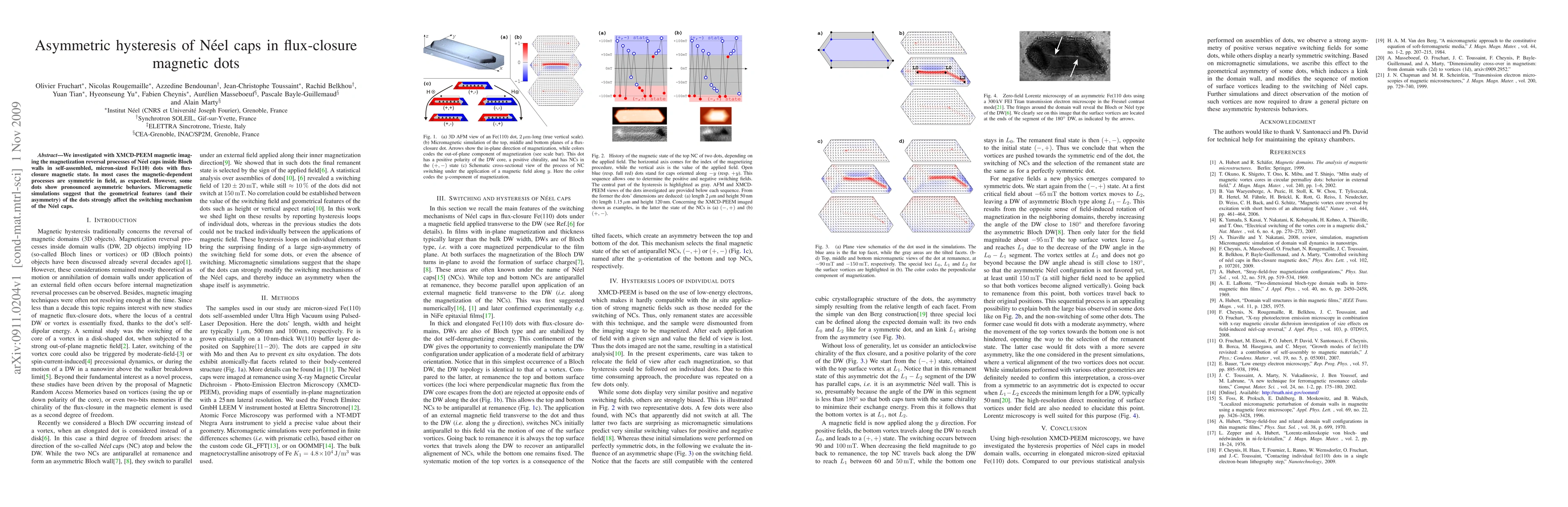 We investigated with XMCD-PEEM magnetic imaging the magnetization reversal processes of N\'eel caps inside Bloch walls in self-assembled, micron-sized Fe(110) dots with flux-closure magnetic state. In most cases the magnetic-dependent processes are symmetric in field, as expected. However, some dots show pronounced asymmetric behaviors. Micromagnetic simulations suggest that the geometrical features (and their asymmetry) of the dots strongly affect the switching mechanism of the N\'eel caps.