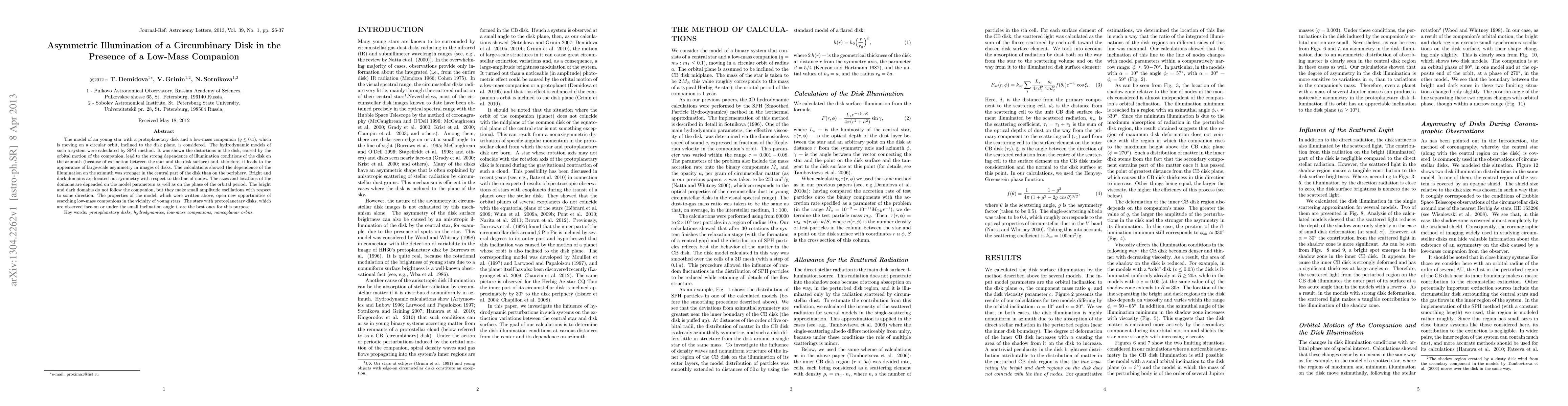 The model of an young star with a protoplanetary disk and a low-mass companion, which is moving on a circular orbit, inclined to the disk plane, is considered. The hydrodynamic models of such a system were calculated by SPH method. It was shown the distortions in the disk, caused by the orbital motion of the companion, lead to the strong dependence of illumination conditions of the disk on the azimuth (because of extinction between the star and the disk surface) and, therefore, it leads to the appearance of large-scale asymmetry in images of disks. The calculations showed the dependence of the illumination on the azimuth was stronger in the central part of the disk than on the periphery. Bright and dark domains are located not symmetry with respect to the line of nodes. The sizes and locations of the domains are depended on the model parameters as well as on the phase of the orbital period. The bright and dark domains do not follow the companion, but they make small amplitude oscillations with respect to some direction. The properties of the model, which were written above, open new opportunities of searching low-mass companions in the vicinity of young stars. The stars with protoplanetary disks, which are observed face-on or under the small inclination angle i, are the best ones for this purpose.