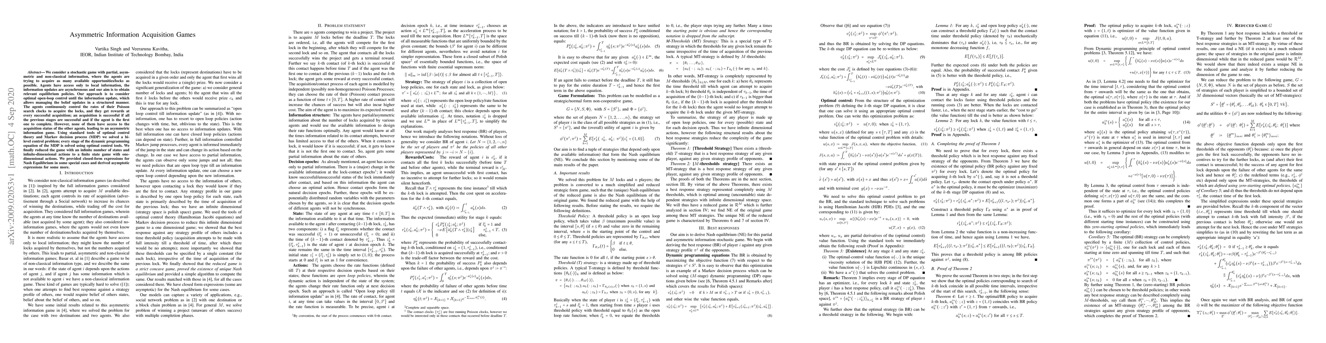 This paper studies a stochastic game with asymmetric information where agents aim to acquire opportunities using local, asynchronous updates. It employs optimal control theory and Markov decision processes to solve a bi-level control problem, deriving closed-form and asymptotic Nash Equilibrium expressions for specific scenarios.