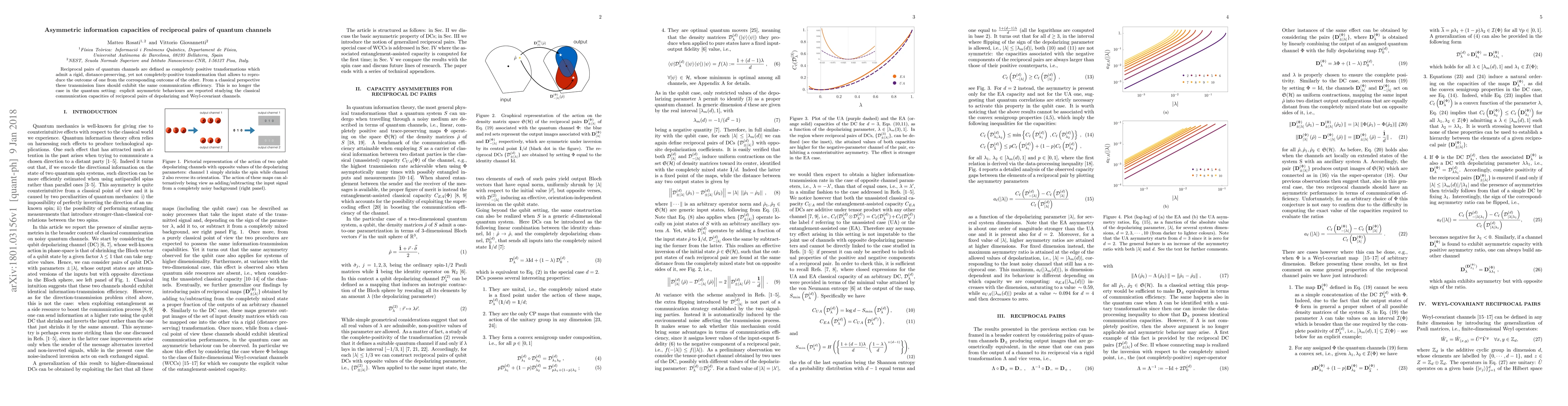 Reciprocal pairs of quantum channels are defined as completely positive transformations which admit a rigid, distance-preserving, yet not completely-positive transformation that allows to reproduce the outcome of one from the corresponding outcome of the other. From a classical perspective these transmission lines should exhibit the same communication efficiency. This is no longer the case in the quantum setting: explicit asymmetric behaviours are reported studying the classical communication capacities of reciprocal pairs of depolarizing and Weyl-covariant channels.