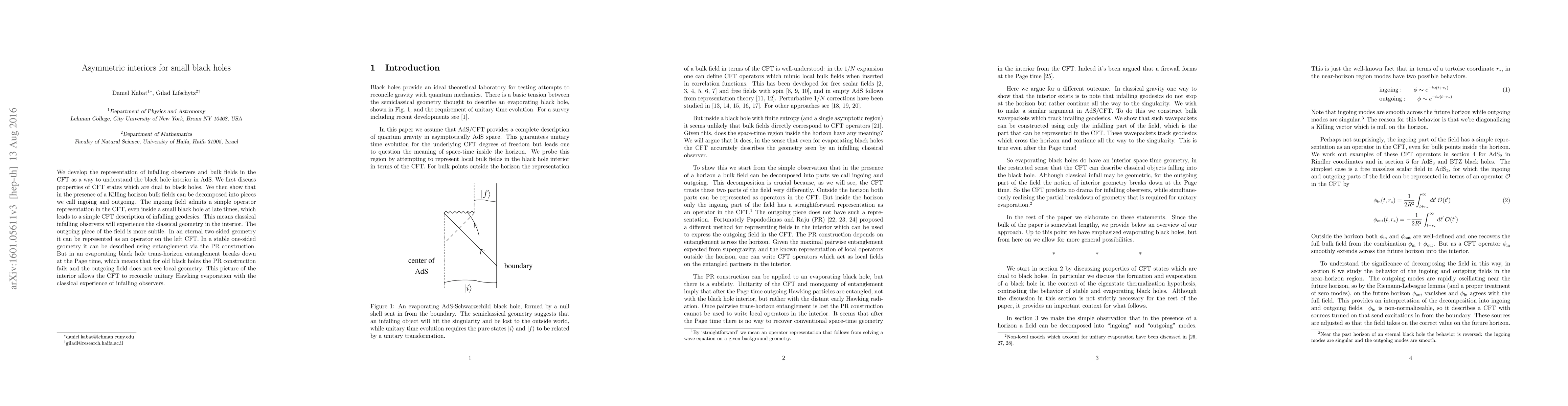 This research proposes a method to understand small black hole interiors in AdS using CFT representations. It identifies ingoing and outgoing bulk field pieces, with ingoing fields having a straightforward CFT operator representation, ensuring classical geometry experience for infalling observers. However, outgoing fields pose challenges, particularly in evaporating black holes where entanglement breaks down at the Page time, impacting the PR construction and local geometry perception.