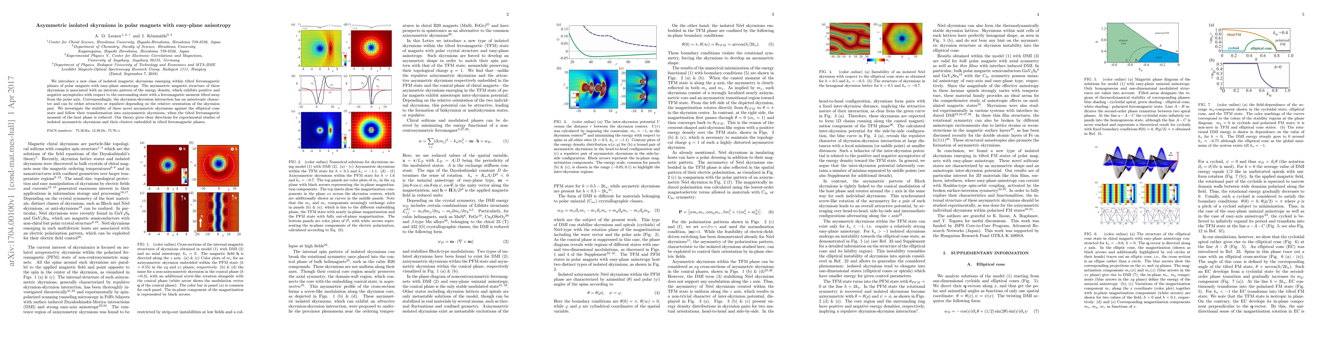 This paper introduces asymmetric isolated skyrmions in polar magnets with easy-plane anisotropy, revealing their unique energy density patterns and anisotropic interaction. The study explores their stability and transformation into axisymmetric skyrmions under varying conditions, providing a theoretical framework for experimental investigations.