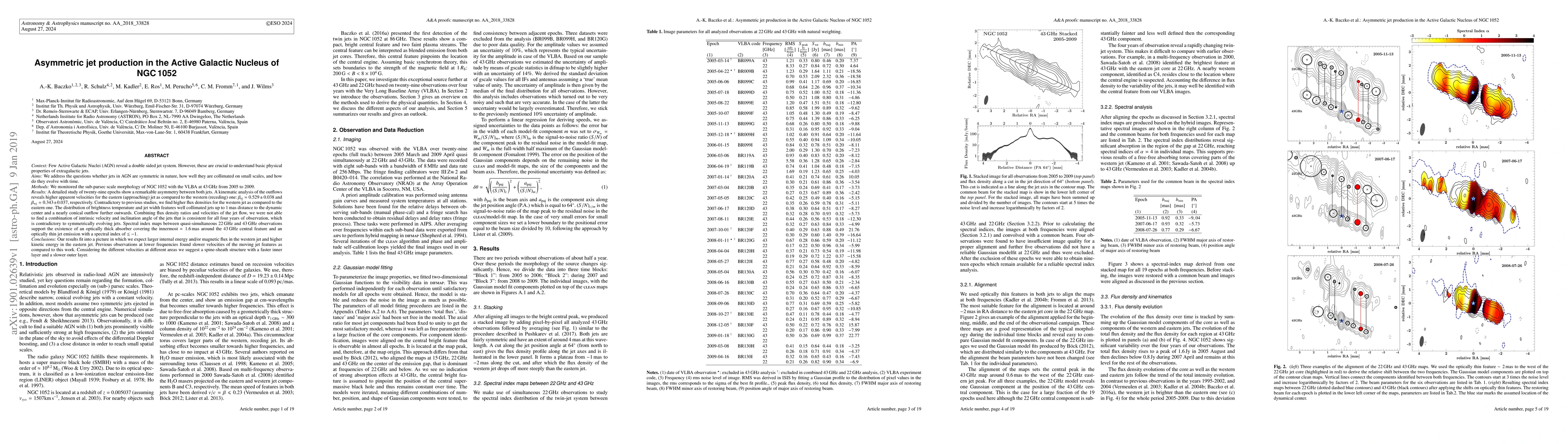 Context: Few Active Galactic Nuclei (AGN) reveal a double sided jet system. However, these are crucial to understand basic physical properties of extragalactic jets. Aims: We address the questions whether jets in AGN are symmetric in nature, how well they are collimated on small scales, and how do they evolve with time. Methods: We monitored the sub-parsec scale morphology of NGC1052 with the VLBA at 43GHz from 2005 to 2009. Results: A detailed study of 29 epochs show an asymmetry between both jets. A kinematic analysis of the outflows reveals higher apparent velocities for the eastern jet as compared to the western one: beta_ej = 0.529+-0.038 and beta_wj = 0.343+-0.037, respectively. Contradictory to previous studies, we find higher flux densities for the western jet. The distribution of brightness temperature and jet width features well collimated jets up to 1mas distance to the dynamic center and a nearly conical outflow further outwards. Combining flux density ratios and velocities of the jet flow, we were not able to find a combination of intrinsic velocity and inclination angle of the jets that is consistent for all observations, which is contradictory to symmetrically evolving jets. Spectral index maps between quasi-simultaneous 22GHz and 43GHz observations support the existence of an optically thick absorber covering the innermost 1.6 mas around the 43GHz central feature and an optically thin jet emission with a spectral index of <= -1. Conclusions: Our results fit into a picture in which we expect larger internal energy and/or magnetic flux in the western jet and higher kinetic energy in the eastern jet. Previous observations at lower frequencies found slower velocities of the moving jet features as compared to this work. Considering the different velocities at different areas we suggest a spine-sheath structure with a faster inner layer and a slower outer layer.