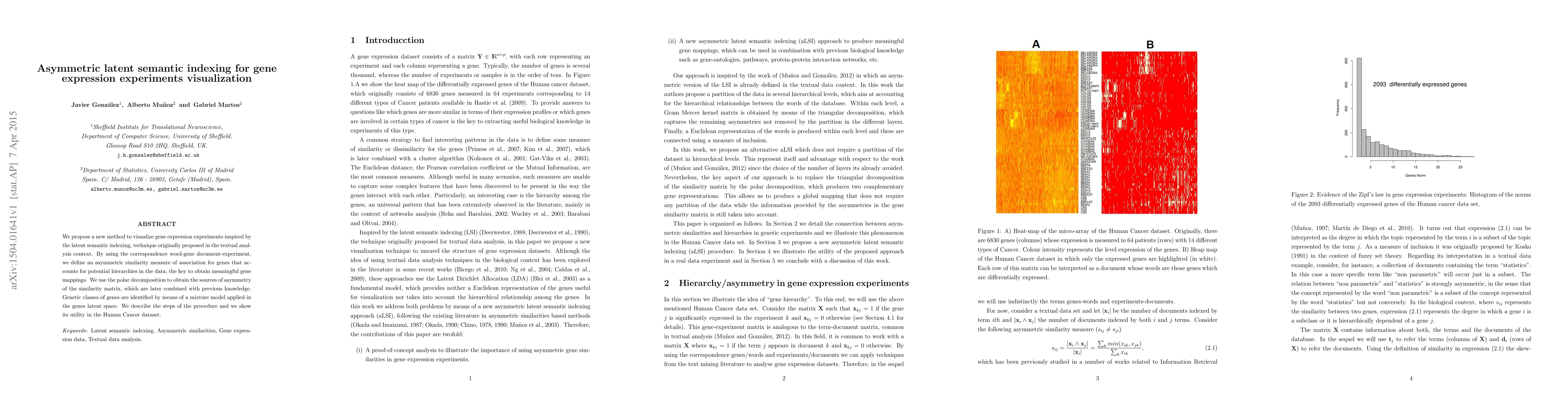 This paper proposes a novel method for visualizing gene expression experiments using asymmetric latent semantic indexing, adapting the latent semantic indexing technique from textual analysis. The method identifies genetic classes of genes through a mixture model in the genes' latent space, demonstrating its utility in the Human Cancer dataset.