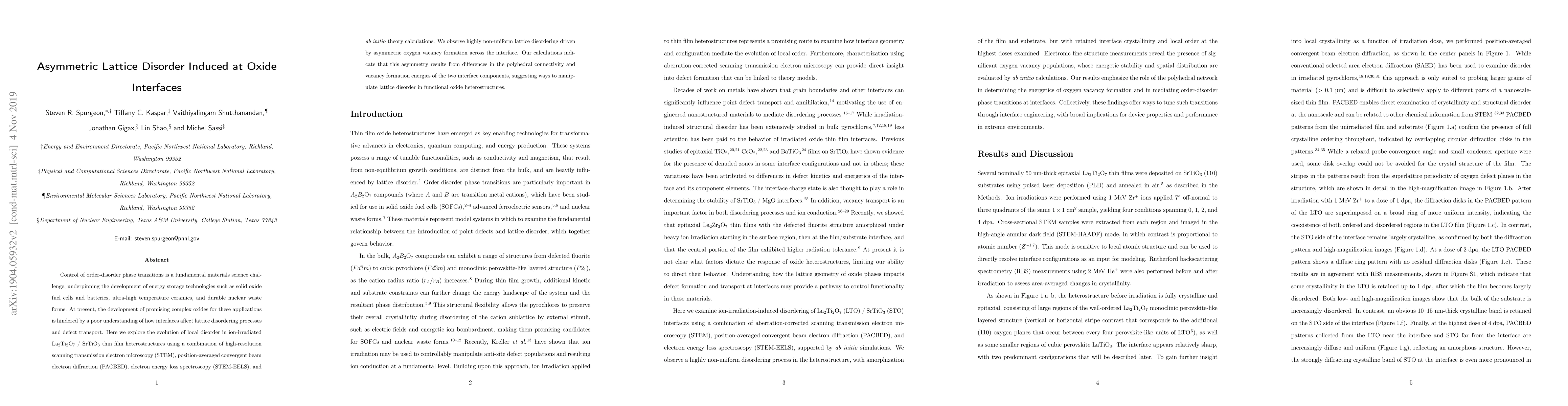 Control of order-disorder phase transitions is a fundamental materials science challenge, underpinning the development of energy storage technologies such as solid oxide fuel cells and batteries, ultra-high temperature ceramics, and durable nuclear waste forms. At present, the development of promising complex oxides for these applications is hindered by a poor understanding of how interfaces affect lattice disordering processes and defect transport. Here we explore the evolution of local disorder in ion-irradiated La$_2$Ti$_2$O$_7$ / SrTiO$_3$ thin film heterostructures using a combination of high-resolution scanning transmission electron microscopy (STEM), position-averaged convergent beam electron diffraction (PACBED), electron energy loss spectroscopy (STEM-EELS), and \textit{ab initio} theory calculations. We observe highly non-uniform lattice disordering driven by asymmetric oxygen vacancy formation across the interface. Our calculations indicate that this asymmetry results from differences in the polyhedral connectivity and vacancy formation energies of the two interface components, suggesting ways to manipulate lattice disorder in functional oxide heterostructures.