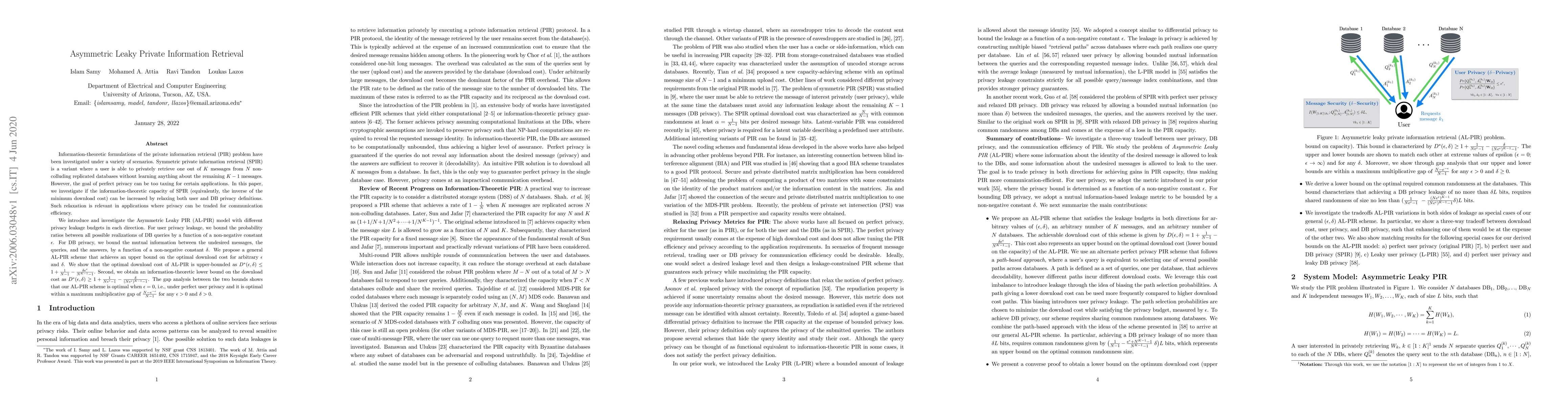 Researchers introduce Asymmetric Leaky Private Information Retrieval (AL-PIR), a model that balances user and database privacy by allowing limited leakage, to increase information-theoretic capacity and improve download costs for private message retrieval.
