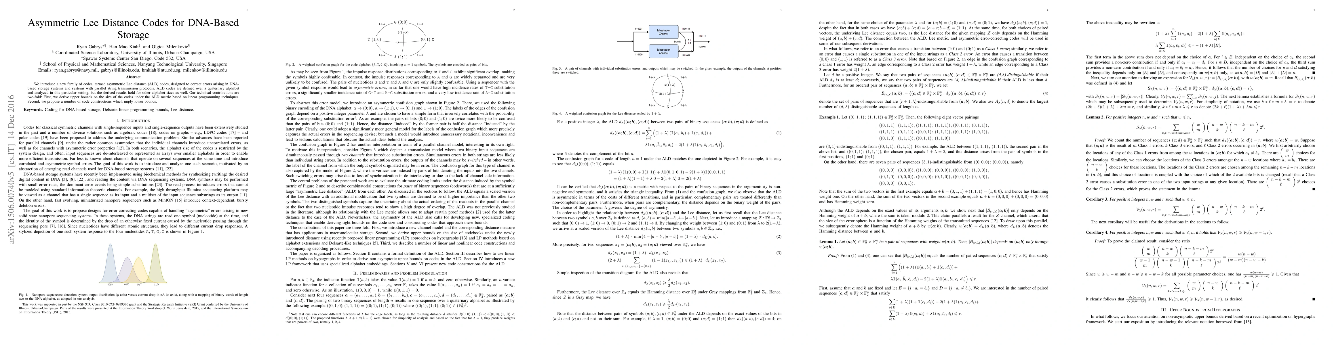 We consider a new family of codes, termed asymmetric Lee distance codes, that arise in the design and implementation of DNA-based storage systems and systems with parallel string transmission protocols. The codewords are defined over a quaternary alphabet, although the results carry over to other alphabet sizes; furthermore, symbol confusability is dictated by their underlying binary representation. Our contributions are two-fold. First, we demonstrate that the new distance represents a linear combination of the Lee and Hamming distance and derive upper bounds on the size of the codes under this metric based on linear programming techniques. Second, we propose a number of code constructions which imply lower bounds.