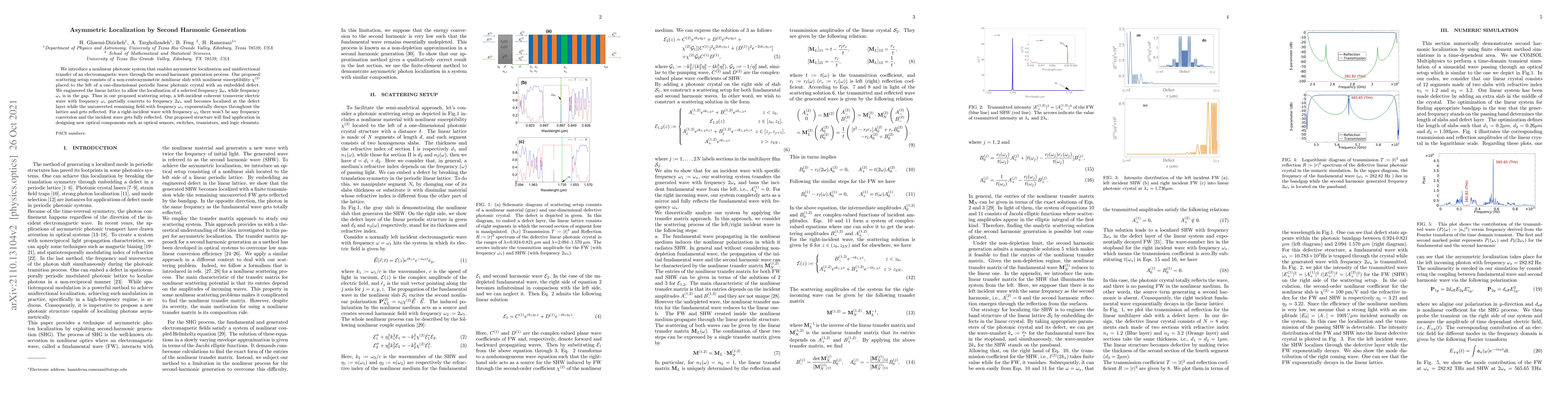 We introduce a nonlinear photonic system that enables asymmetric localization and unidirectional transfer of an electromagnetic wave through the second harmonic generation process. Our proposed scattering setup consists of a non-centrosymmetric nonlinear slab with nonlinear susceptibility $\chi^{(2)}$ placed to the left of a one-dimensional periodic linear photonic crystal with an embedded defect. We engineered the linear lattice to allow the localization of a selected frequency $2\omega_\star$ while frequency $\omega_\star$ is in the gap. Thus in our proposed scattering setup, a left-incident coherent transverse electric wave with frequency $\omega_\star$ partially converts to frequency $2\omega_\star$ and becomes localized at the defect layer while the unconverted remaining field with frequency $\omega_\star$ exponentially decays throughout the lattice and gets reflected. For a right-incident wave with frequency $\omega_\star$ there won't be any frequency conversion and the incident wave gets fully reflected. Our proposed structure will find application in designing new optical components such as optical sensors, switches, transistors, and logic elements.