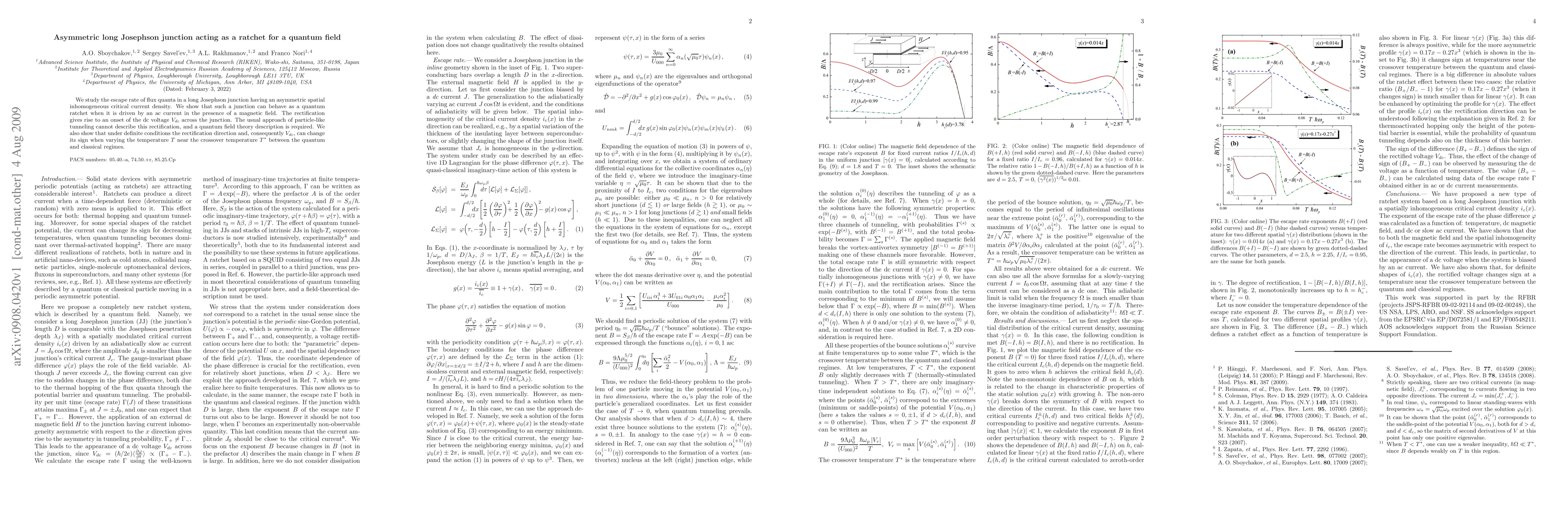 We study the escape rate of flux quanta in a long Josephson junction having an asymmetric spatial inhomogeneous critical current density. We show that such a junction can behave as a quantum ratchet when it is driven by an ac current in the presence of a magnetic field. The rectification gives rise to an onset of the dc voltage across the junction. The usual approach of particle-like tunneling cannot describe this rectification, and a quantum field theory description is required. We also show that under definite conditions the rectification direction and, consequently the dc voltage, can change its sign when varying the temperature near the crossover temperature between the quantum and classical regimes.