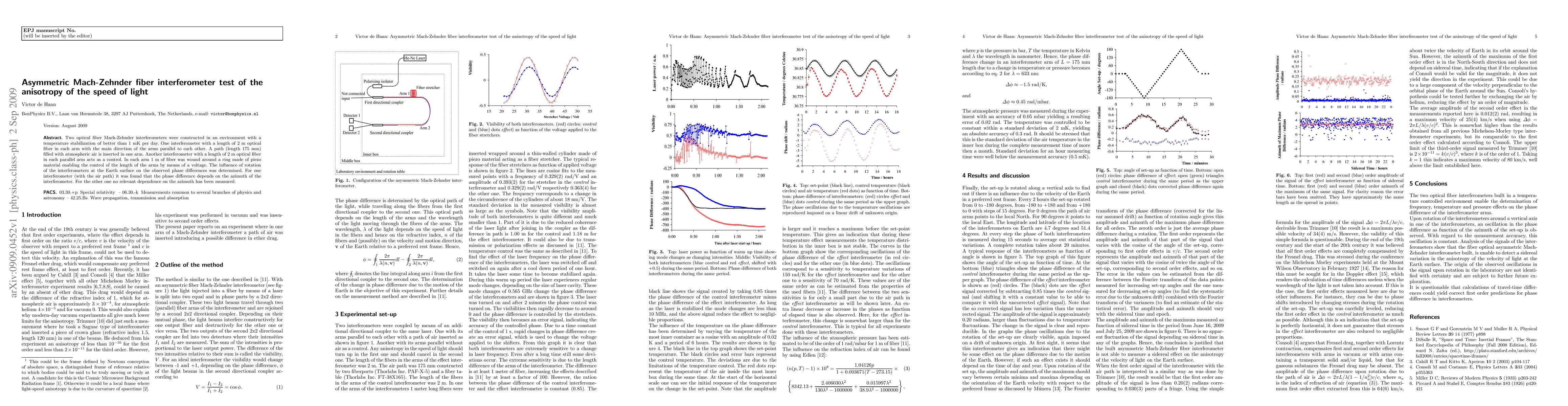 This study employs asymmetric Mach-Zehnder fiber interferometers to test for anisotropy in the speed of light, finding a dependence on azimuth for the interferometer with an air path, while the control interferometer shows no such effect. The research involves precise temperature stabilization and length adjustment via piezoelectric materials.