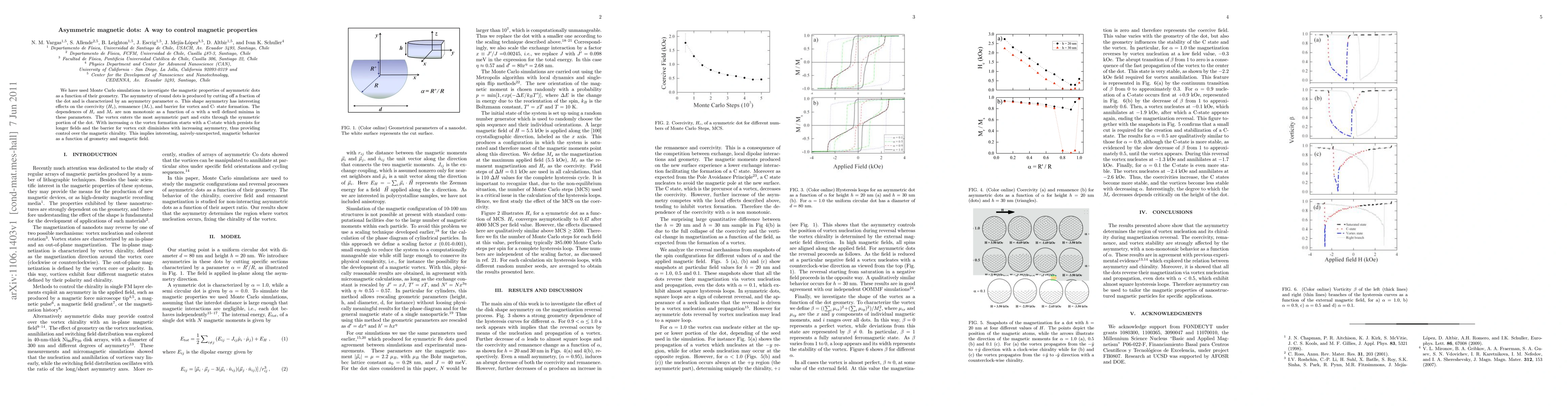 We have used Monte Carlo simulations to investigate the magnetic properties of asymmetric dots as a function of their geometry. The asymmetry of round dots is produced by cutting off a fraction of the dot and is characterized by an asymmetry parameter $\alpha$. This shape asymmetry has interesting effects on the coercivity ($H_{c}$), remanence ($M_{r}$), and barrier for vortex and C- state formation. The dependences of $H_{c}$ and $M_{r}$ are non monotonic as a function of $\alpha$ with a well defined minima in these parameters. The vortex enters the most asymmetric part and exits through the symmetric portion of the dot. With increasing $\alpha $ the vortex formation starts with a C-state which persists for longer fields and the barrier for vortex exit diminishes with increasing asymmetry, thus providing control over the magnetic chirality. This implies interesting, naively-unexpected, magnetic behavior as a function of geometry and magnetic field.