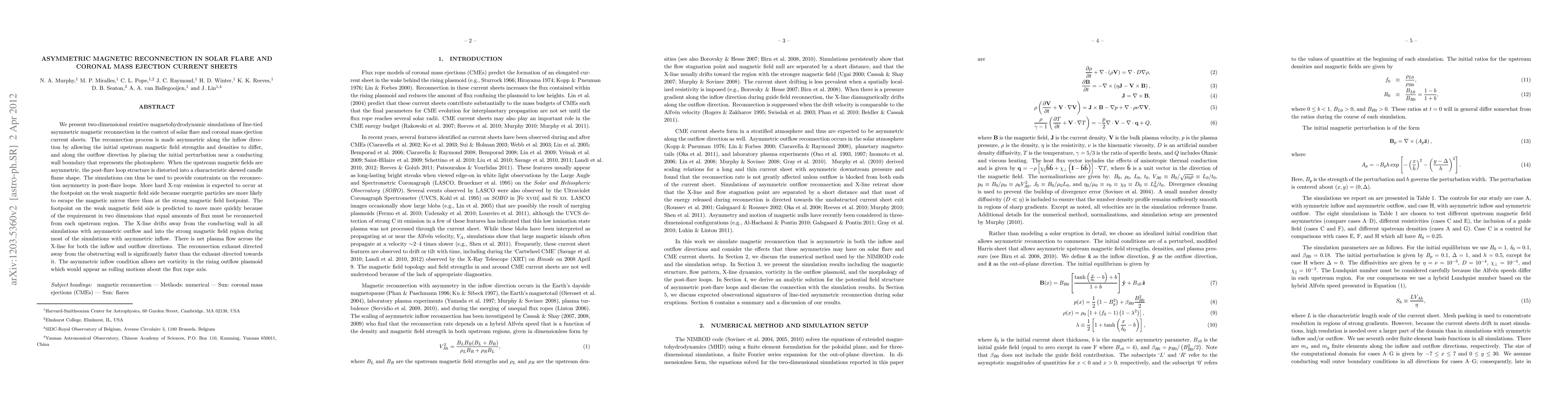 This paper investigates asymmetric magnetic reconnection in solar flare and coronal mass ejection current sheets using 2D resistive magnetohydrodynamic simulations. The study finds that asymmetric upstream magnetic fields distort post-flare loops into skewed shapes, with more hard X-ray emission expected on the weak field side due to energetic particle escape.