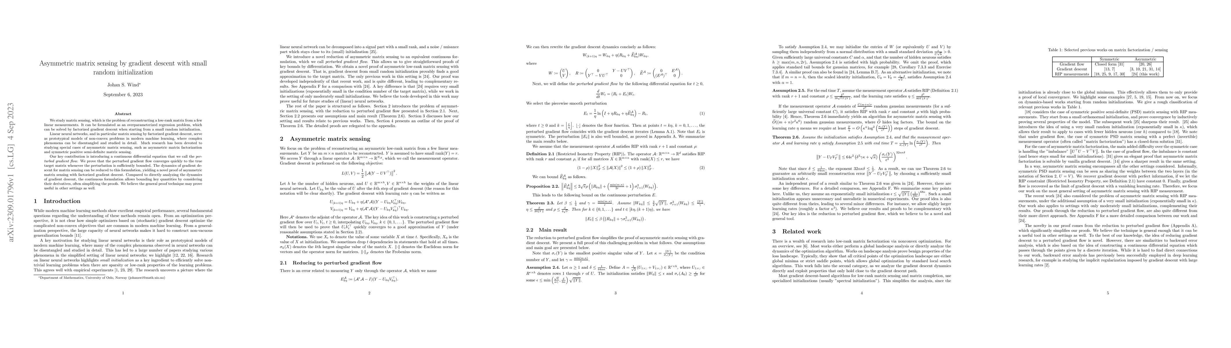 This paper studies asymmetric matrix sensing, focusing on reconstructing low-rank matrices from few measurements using factorized gradient descent. The authors introduce a novel "perturbed gradient flow" differential equation to prove the rapid convergence of gradient descent, providing a simplified and general proof technique for asymmetric matrix sensing.