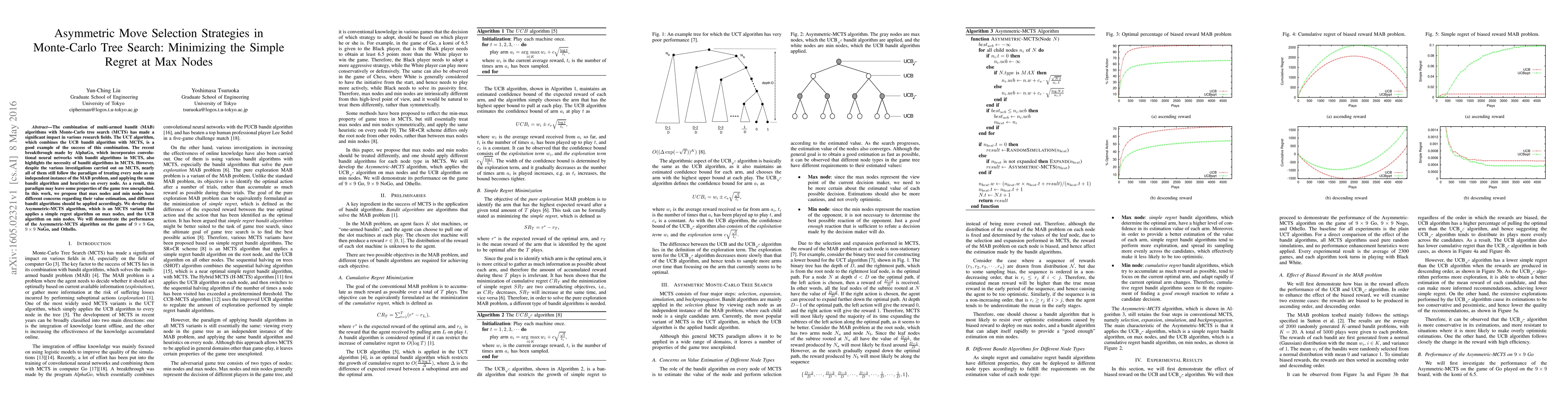 The combination of multi-armed bandit (MAB) algorithms with Monte-Carlo tree search (MCTS) has made a significant impact in various research fields. The UCT algorithm, which combines the UCB bandit algorithm with MCTS, is a good example of the success of this combination. The recent breakthrough made by AlphaGo, which incorporates convolutional neural networks with bandit algorithms in MCTS, also highlights the necessity of bandit algorithms in MCTS. However, despite the various investigations carried out on MCTS, nearly all of them still follow the paradigm of treating every node as an independent instance of the MAB problem, and applying the same bandit algorithm and heuristics on every node. As a result, this paradigm may leave some properties of the game tree unexploited. In this work, we propose that max nodes and min nodes have different concerns regarding their value estimation, and different bandit algorithms should be applied accordingly. We develop the Asymmetric-MCTS algorithm, which is an MCTS variant that applies a simple regret algorithm on max nodes, and the UCB algorithm on min nodes. We will demonstrate the performance of the Asymmetric-MCTS algorithm on the game of $9\times 9$ Go, $9\times 9$ NoGo, and Othello.
