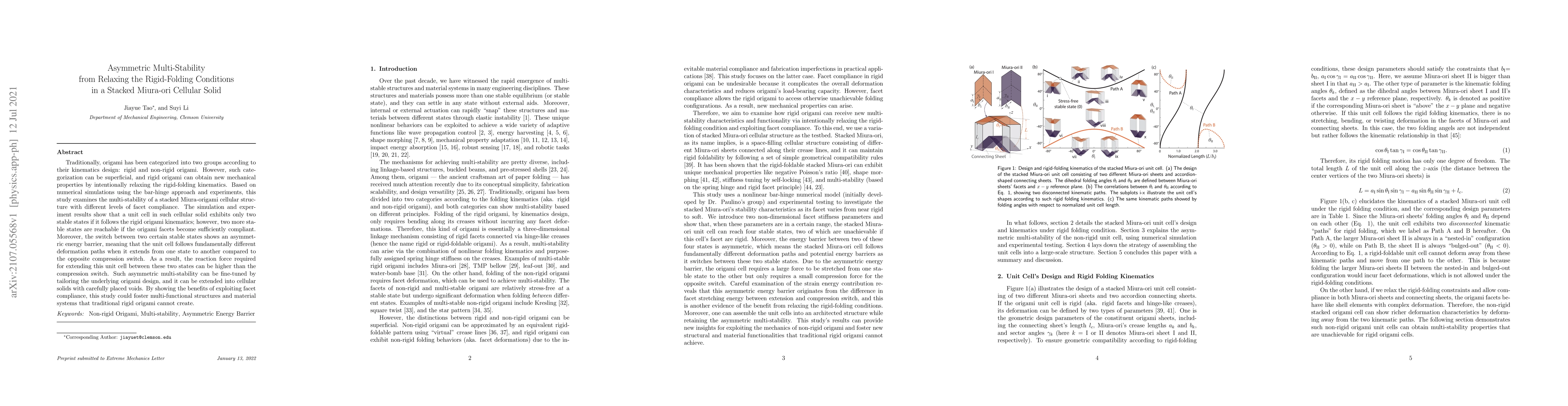 This study investigates the multi-stability of a stacked Miura-ori cellular solid by relaxing rigid-folding conditions, revealing that compliant facets enable four stable states, including asymmetric energy barriers. Tailoring the origami design can fine-tune this asymmetric multi-stability, potentially leading to multifunctional material systems beyond traditional rigid origami.