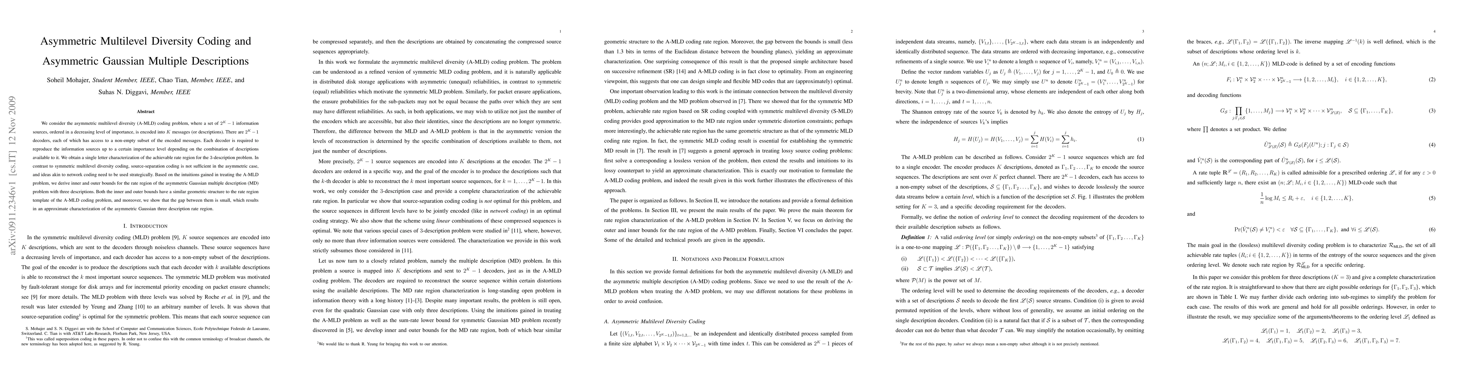 This research paper characterizes the rate region for asymmetric multilevel diversity coding and Gaussian multiple descriptions with three descriptions, finding that network-like ideas are necessary to achieve optimal rates.