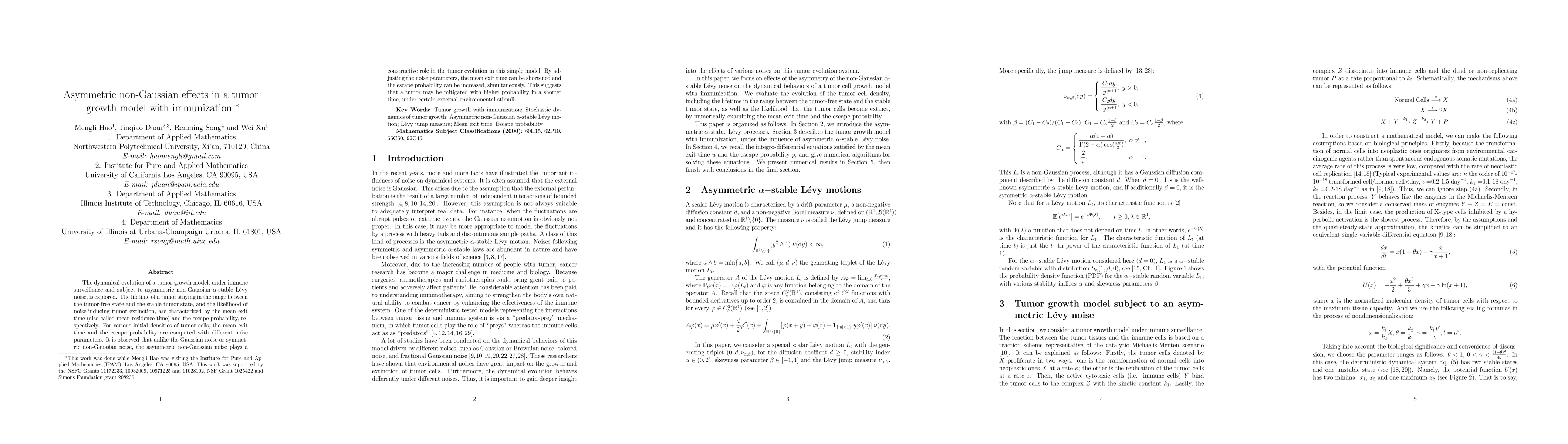This paper investigates a tumor growth model under immune surveillance and asymmetric non-Gaussian $\alpha$-stable Lévy noise, finding that the noise can effectively reduce the mean exit time and increase the escape probability, suggesting a potential method for tumor mitigation.