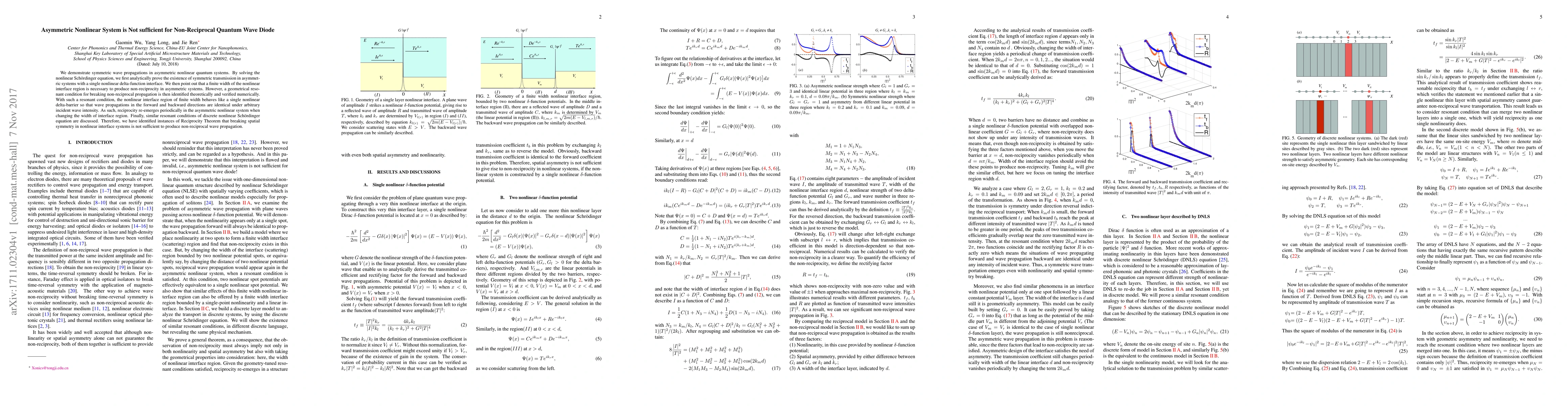 This paper demonstrates that symmetric wave propagations exist in asymmetric nonlinear quantum systems, even with a single nonlinear delta-function interface. It concludes that a finite width of the nonlinear interface is necessary for non-reciprocity, but a resonant condition can restore reciprocity, showing that breaking spatial symmetry alone is not sufficient for non-reciprocal wave propagation.