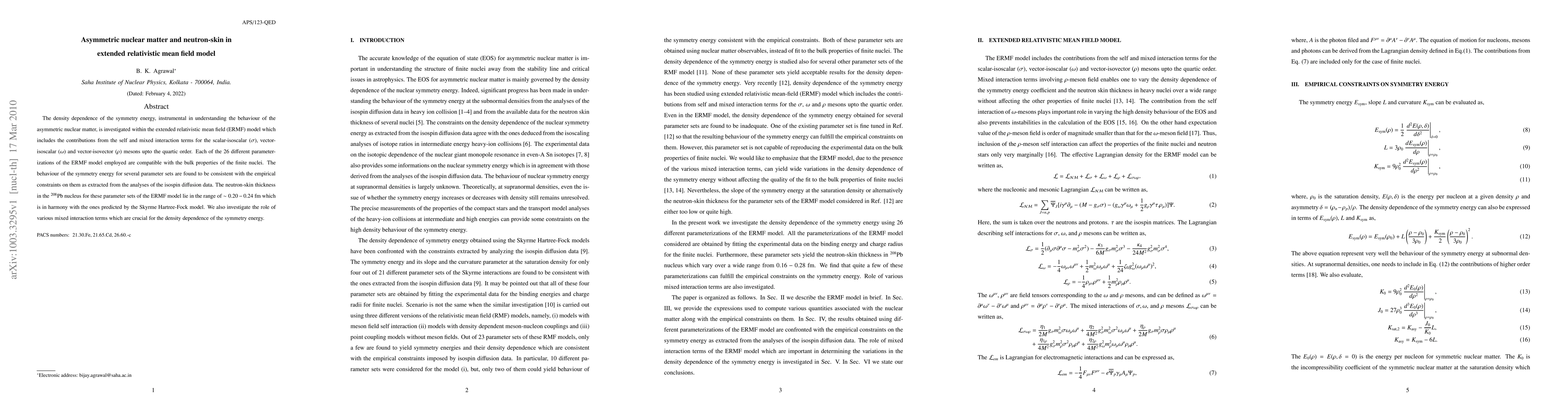 This paper investigates the density dependence of symmetry energy in asymmetric nuclear matter using the extended relativistic mean field model, finding consistency with empirical constraints and predicting neutron-skin thickness in $^{208}$Pb within a range compatible with other models. The study highlights the importance of mixed interaction terms for understanding the symmetry energy.