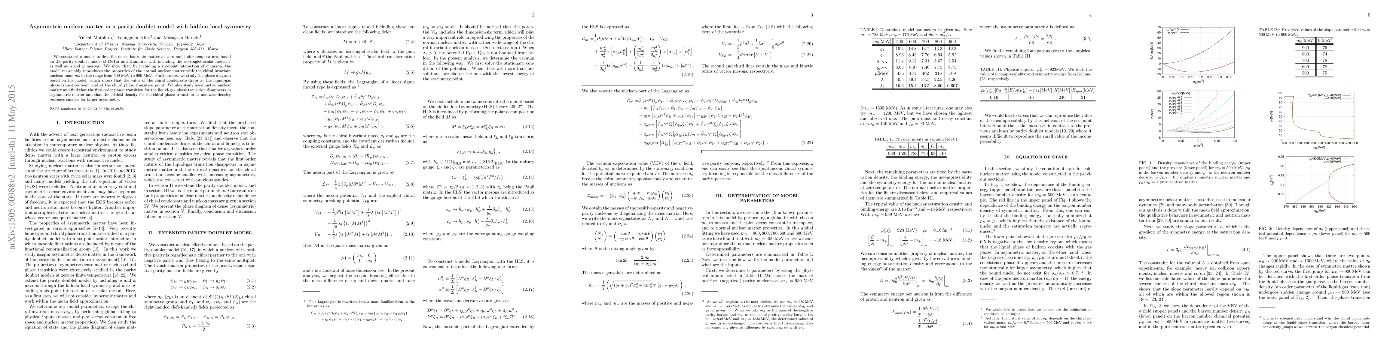This paper constructs a parity doublet model incorporating hidden local symmetry to describe dense hadronic matter, including $\sigma$, $\rho$, and $\omega$ mesons. It shows that the model can reproduce normal nuclear matter properties and analyzes the phase diagram, revealing that asymmetric nuclear matter alters the phase transition behavior, eliminating the first-order liquid-gas transition and reducing the critical density for chiral phase transitions with increasing asymmetry.