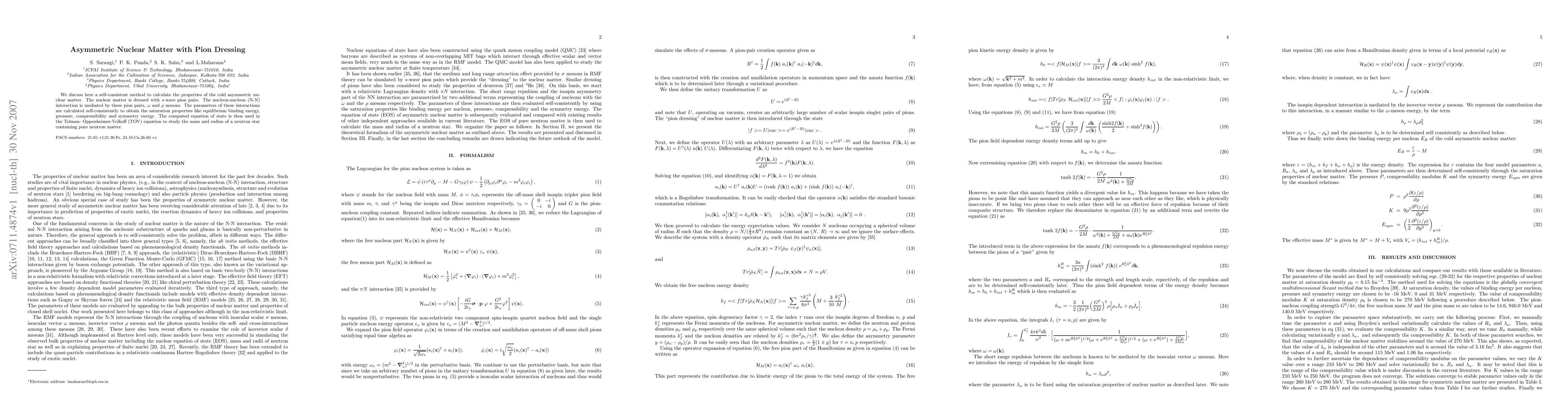 This paper presents a self-consistent method to determine the properties of cold asymmetric nuclear matter influenced by pion dressing and mediated by omega- and rho-mesons. The study evaluates the nucleon-nucleon interaction parameters based on nuclear saturation properties and uses the derived equation of state for pure neutron matter to compute the mass and radius of a pure neutron star.