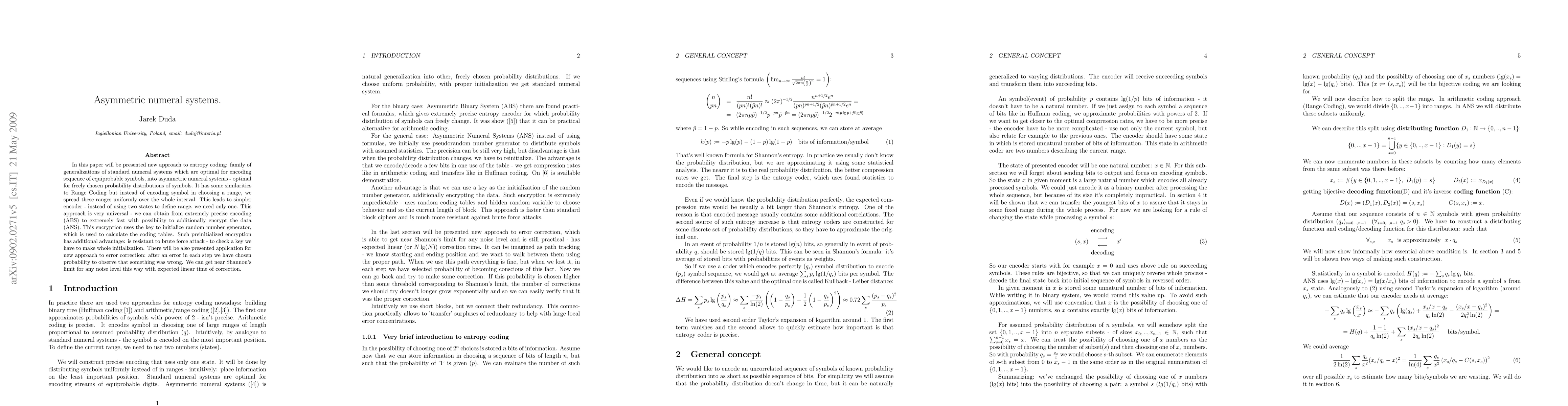 This paper introduces asymmetric numeral systems (ANS), a novel entropy coding method that generalizes standard numeral systems for optimal encoding of sequences with freely chosen symbol probabilities. Unlike Range Coding, ANS spreads ranges uniformly over an interval, simplifying the encoder and enabling precise or fast encoding, with encryption that resists brute force attacks.