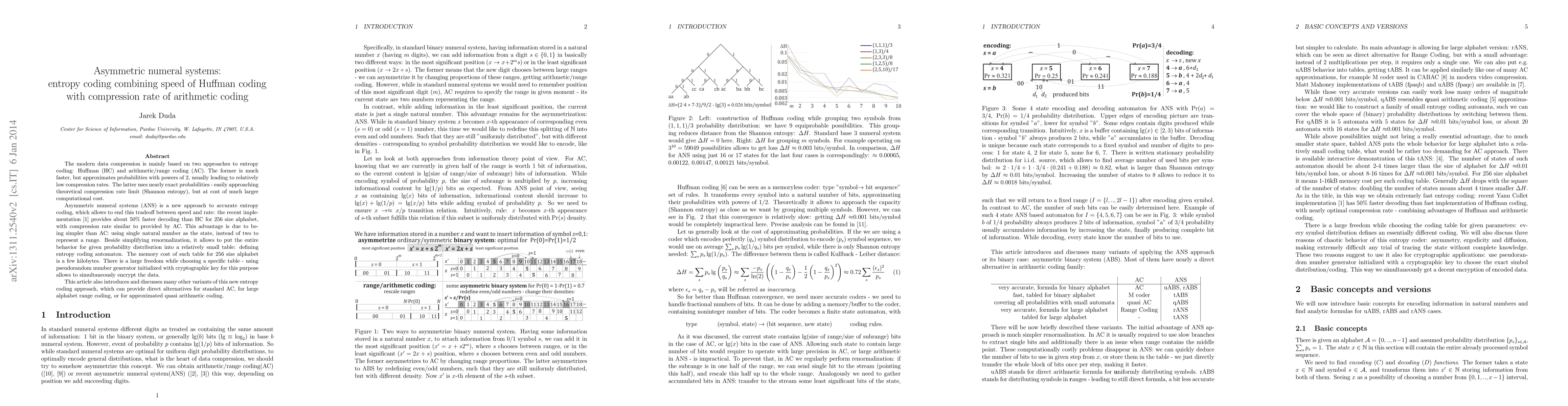 This paper introduces asymmetric numeral systems (ANS) as an innovative entropy coding method that combines the speed of Huffman coding with the compression efficiency of arithmetic coding, offering a significant speedup in decoding while maintaining high compression rates. The simplicity of ANS, using a single natural number to represent state, allows for efficient implementation and potential data encryption.