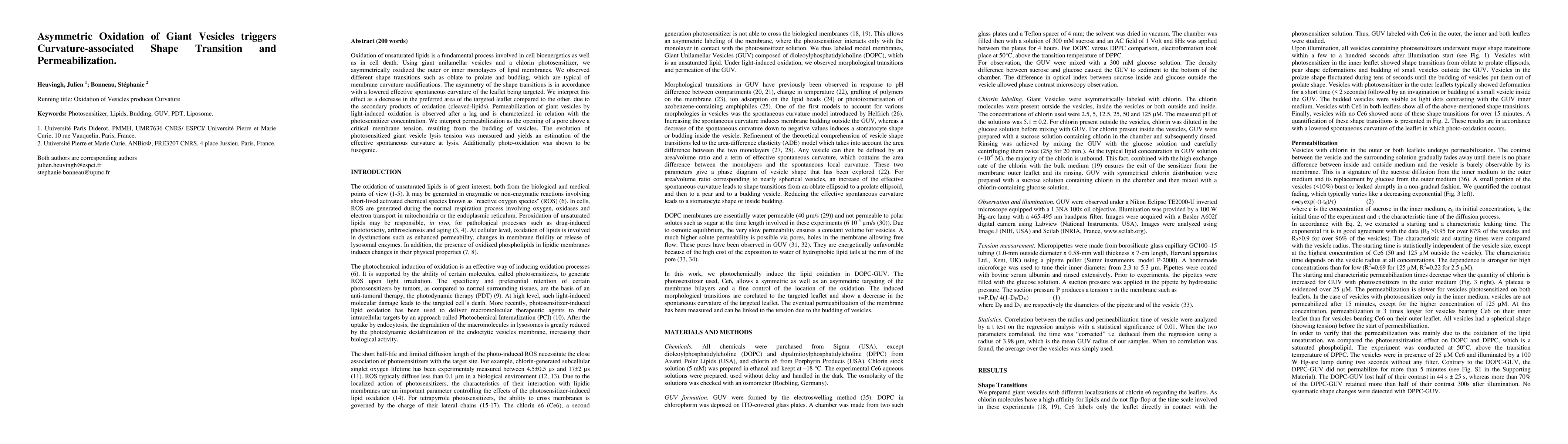 This study investigates the asymmetric oxidation of giant vesicles using a chlorin photosensitizer, revealing shape transitions and permeabilization driven by lipid oxidation. The oxidation alters membrane curvature, leading to oblate-to-prolate transitions and budding, while permeabilization occurs after a lag, indicating pore formation above a critical tension.