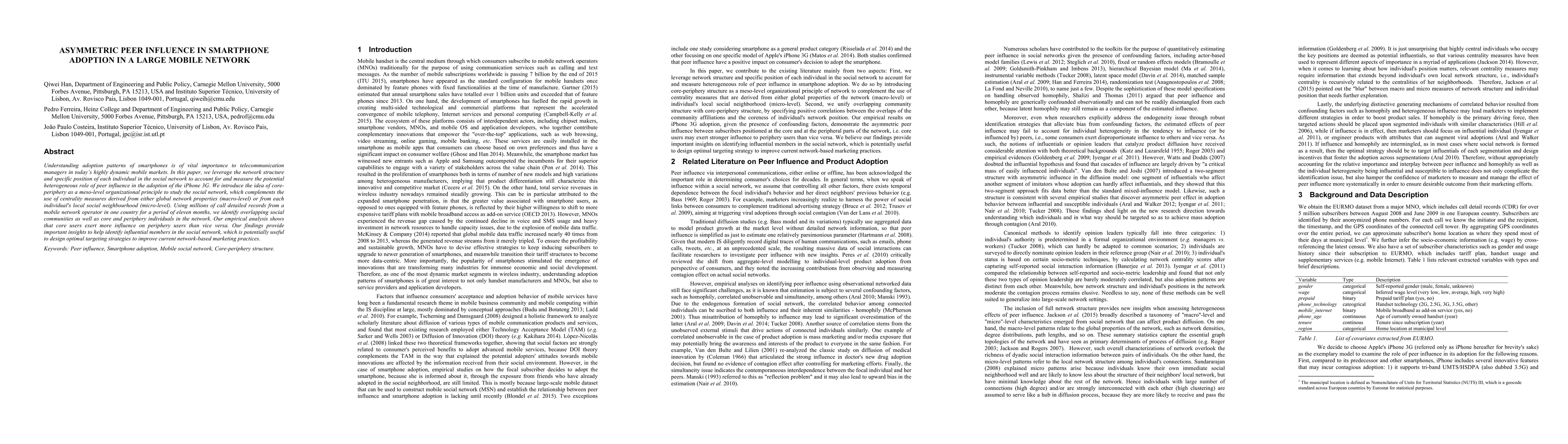 This paper investigates asymmetric peer influence in smartphone adoption, focusing on the iPhone 3G, by analyzing social network structures. It finds that core users in the network have a stronger influence on periphery users, offering insights for targeted marketing strategies.