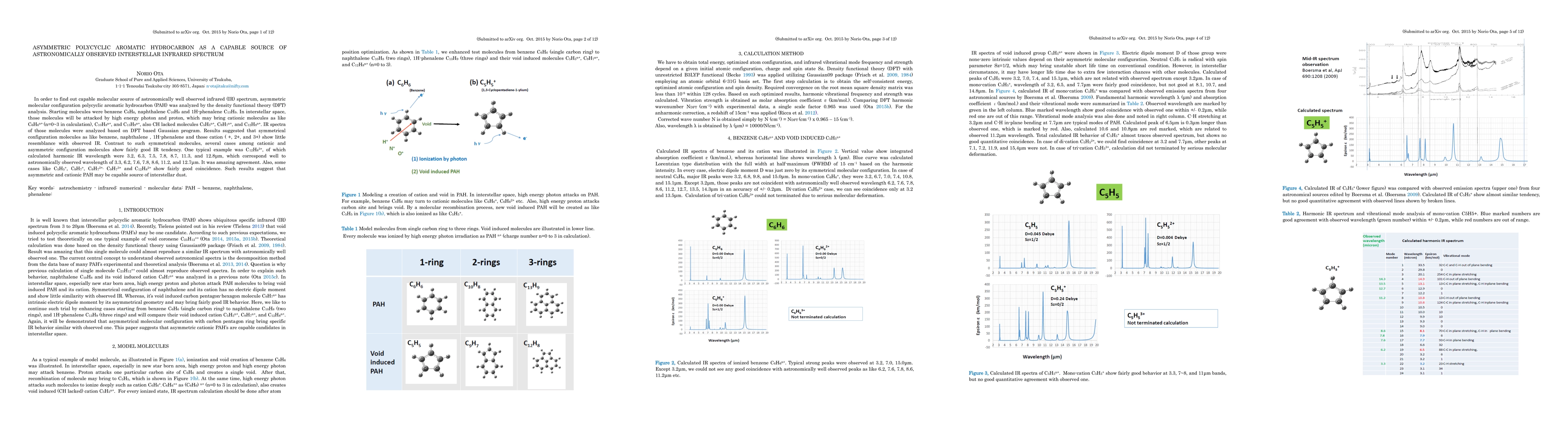 In order to find out capable molecular source of astronomically well observed infrared (IR) spectrum, asymmetric molecular configuration polycyclic aromatic hydrocarbon (PAH) was analyzed by the density functional theory (DFT) analysis. Starting molecules were benzene C6H6, naphthalene C10H8 and 1H-phenalene C13H9. In interstellar space, those molecules will be attacked by high energy photon and proton, which may bring cationic molecules as like C6H6n+ (n=0~3 in calculation), C10H8n+, and C13H9n+, also CH lacked molecules C5H5n+, C9H7n+, and C12H8n+. IR spectra of those molecules were analyzed based on DFT based Gaussian program. Results suggested that symmetrical configuration molecules as like benzene, naphthalene , 1H-phenalene and those cation ( +, 2+, and 3+) show little resemblance with observed IR. Contrast to such symmetrical molecules, several cases among cationic and asymmetric configuration molecules show fairly good IR tendency. One typical example was C12H83+, of which calculated harmonic IR wavelength were 3.2, 6.3, 7.5, 7.8, 8.7, 11.3, and 12.8 micro meter, which correspond well to astronomically observed wavelength of 3.3, 6.2, 7.6, 7.8, 8.6, 11.2, and 12.7 micro meter. It was amazing agreement. Also, some cases like C5H5+, C9H7+, C9H72+, C9H73+ and C12H82+ show fairly good coincidence. Such results suggest that asymmetric and cationic PAH may be capable source of interstellar dust.
