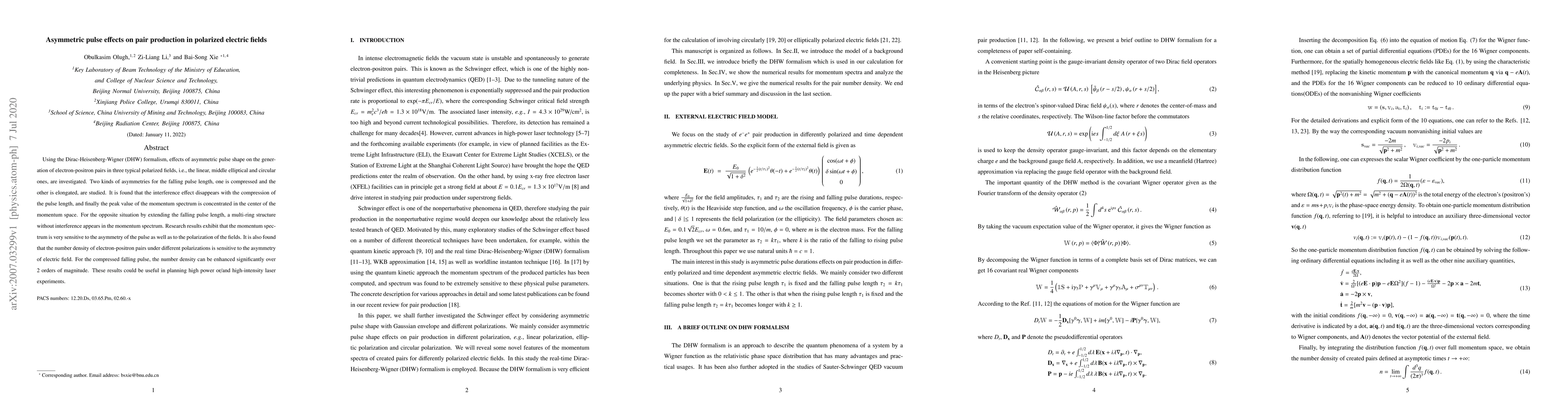 Using the Dirac-Heisenberg-Wigner (DHW) formalism, e?ects of asymmetric pulse shape on the generation of electron-positron pairs in three typical polarized fields, i.e., the linear, middle elliptical and circular ones, are investigated. Two kinds of asymmetries for the falling pulse length, one is compressed and the other is elongated, are studied. It is found that the interference e?ect disappears with the compression of the pulse length, and finally the peak value of the momentum spectrum is concentrated in the center of the momentum space. For the opposite situation by extending the falling pulse length, a multi-ring structure without interference appears in the momentum spectrum. Research results exhibit that the momentum spectrum is very sensitive to the asymmetry of the pulse as well as to the polarization of the fields. It is also found that the number density of electron-positron pairs under di?erent polarizations is sensitive to the asymmetry of electric field. For the compressed falling pulse, the number density can be enhanced significantly over 2 orders of magnitude. These results could be useful in planning high power or/and high-intensity laser experiments.