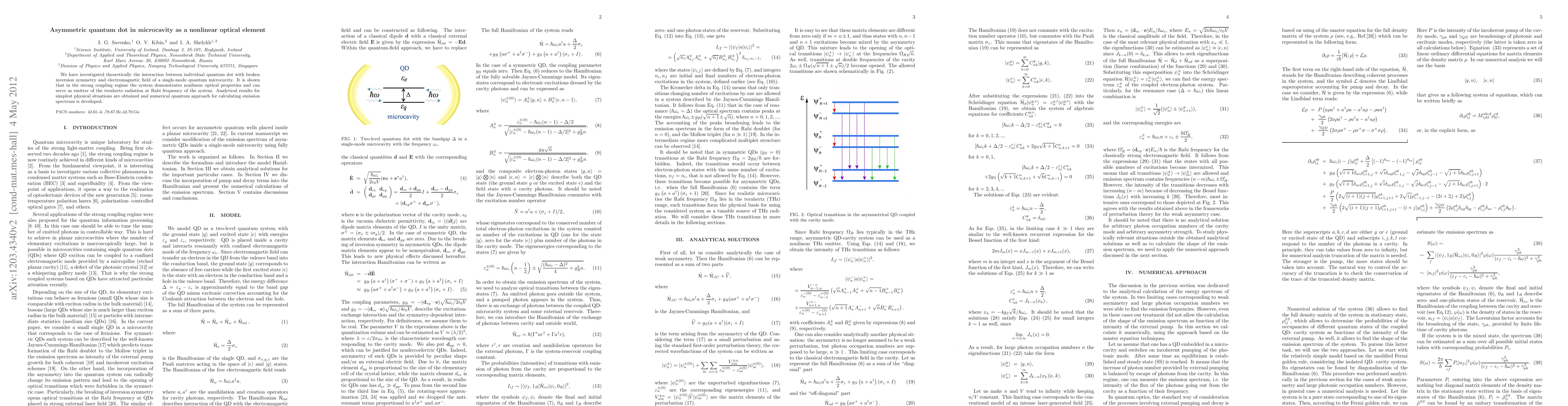 This paper theoretically explores the interaction between an asymmetric quantum dot and a single-mode quantum microcavity, demonstrating nonlinear optical properties in the strong coupling regime. The system can emit terahertz radiation at the system's Rabi frequency, with both analytical and numerical methods developed to calculate the emission spectrum.
