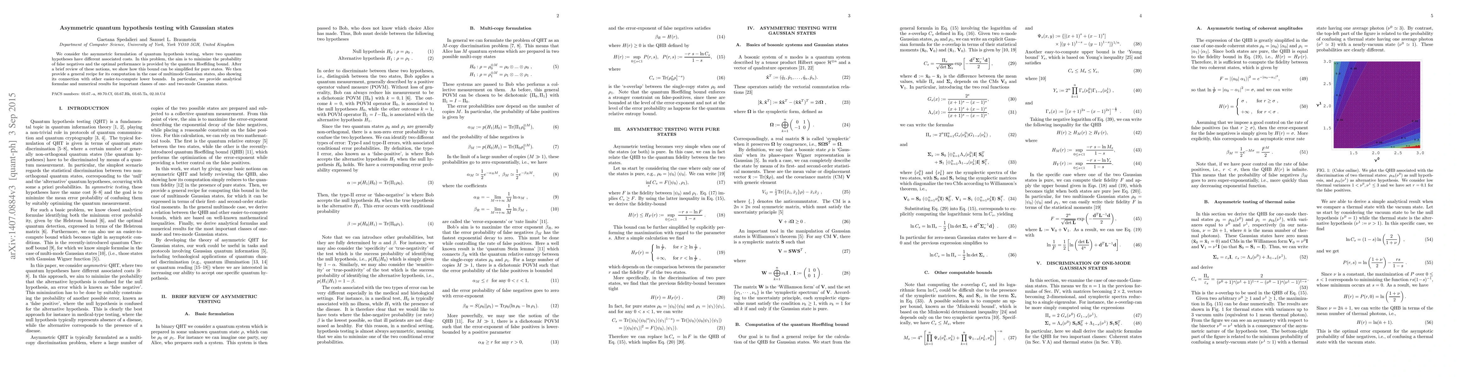 This paper explores asymmetric quantum hypothesis testing with Gaussian states, focusing on minimizing false negatives and deriving the quantum Hoeffding bound. It simplifies the bound for pure states and provides a general method for multimode Gaussian states, offering analytical formulas and numerical results for specific one- and two-mode cases.