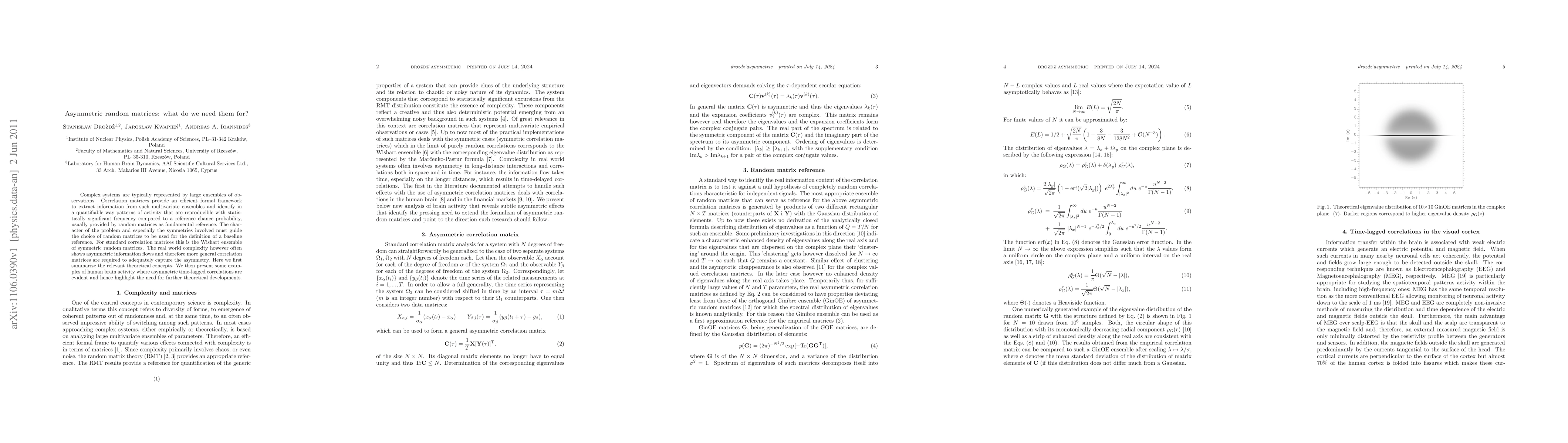 Complex systems are typically represented by large ensembles of observations. Correlation matrices provide an efficient formal framework to extract information from such multivariate ensembles and identify in a quantifiable way patterns of activity that are reproducible with statistically significant frequency compared to a reference chance probability, usually provided by random matrices as fundamental reference. The character of the problem and especially the symmetries involved must guide the choice of random matrices to be used for the definition of a baseline reference. For standard correlation matrices this is the Wishart ensemble of symmetric random matrices. The real world complexity however often shows asymmetric information flows and therefore more general correlation matrices are required to adequately capture the asymmetry. Here we first summarize the relevant theoretical concepts. We then present some examples of human brain activity where asymmetric time-lagged correlations are evident and hence highlight the need for further theoretical developments.