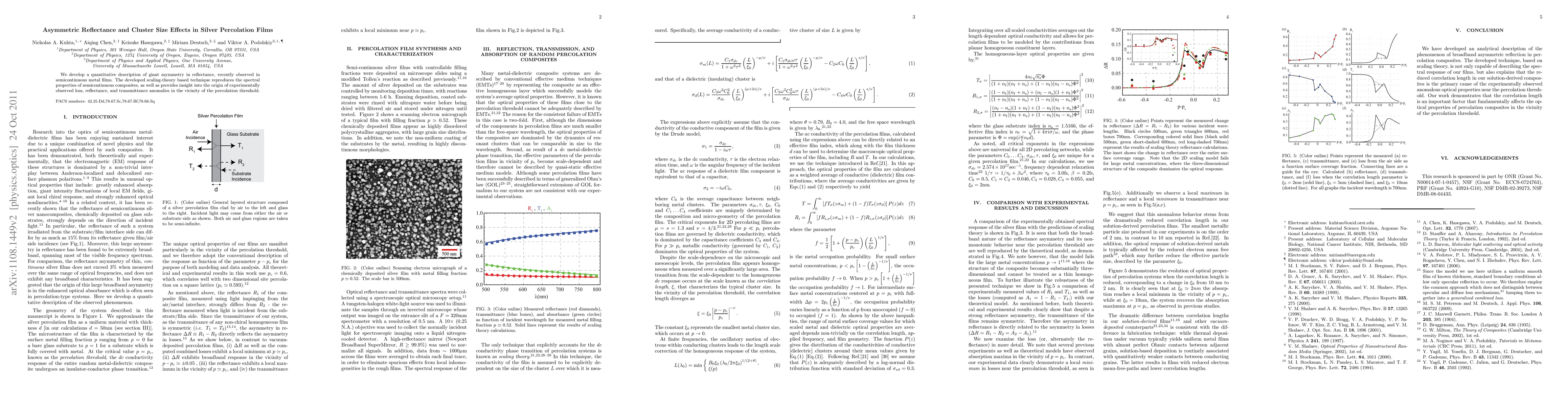 This paper develops a scaling-theory based technique to quantitatively describe the giant asymmetry in reflectance observed in semicontinuous metal films, providing insights into the anomalies in loss, reflectance, and transmittance near the percolation threshold.